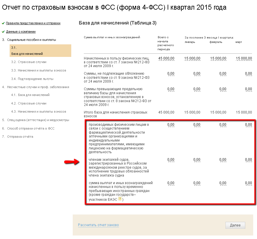 Кроме этого раздел содержит суммы, на которые не начисляются взносы в ФСС на нетрудоспособность по строке с наименованием "Суммы, не подлежащие обложению в соответствии со ст. 9 закона №212-ФЗ от 24 июля 2009 г.". А так же суммы, превышающие предельную величину базы для начисления страховых взносов.Подробнее.