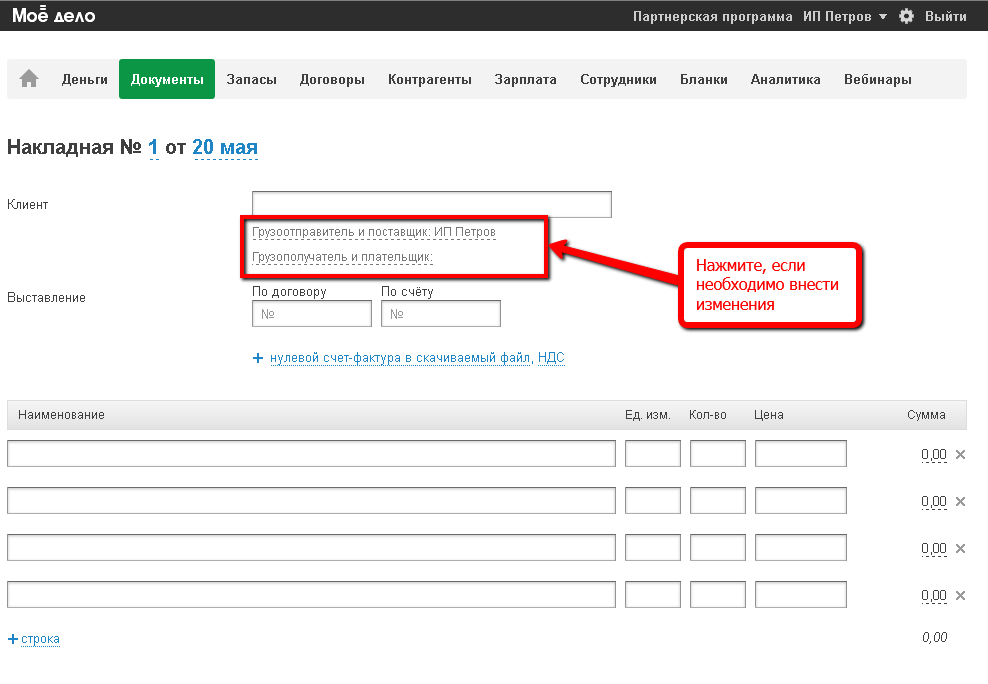 отредактировать Грузоотправителя, Поставщика, Грузополучателя, Плательщика через активные ссылки. По умолчанию Грузоотправитель и Поставщик - ваша организация, Грузополучатель и Плательщик - ваш клиент; (⇑)