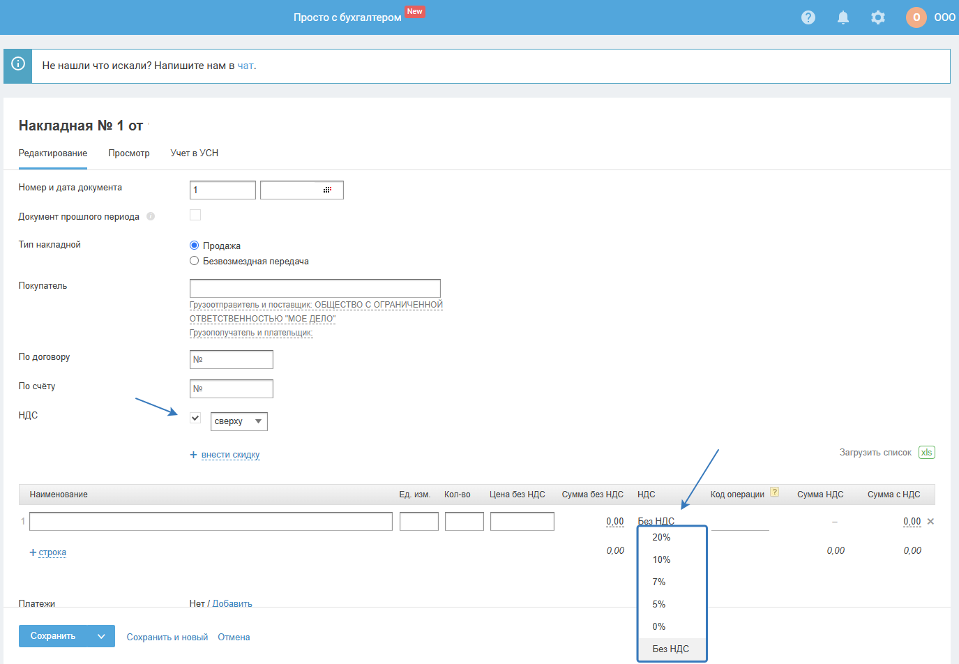 - НДС. Чекбокс по умолчанию выключен. При необходимости выделения НДС включите чекбокс и в графе НДС выберите ставку.
