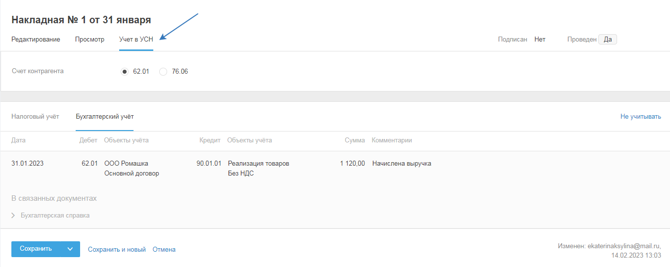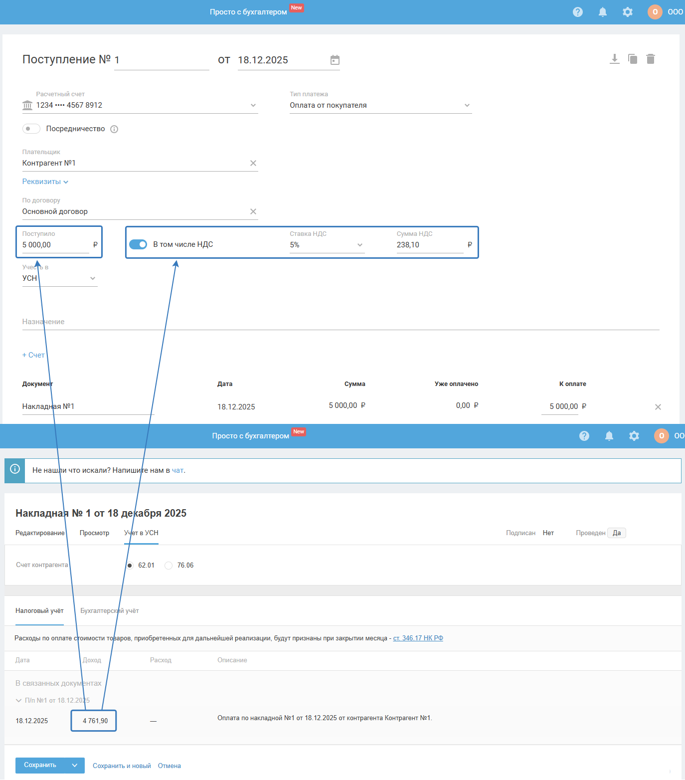 НУ на УСН: если вы создаёте накладную с типом «Продажа» и ваша организация работает с НДС, то в Налоговый учёт попадёт сумма связанного платежа за вычетом НДС: