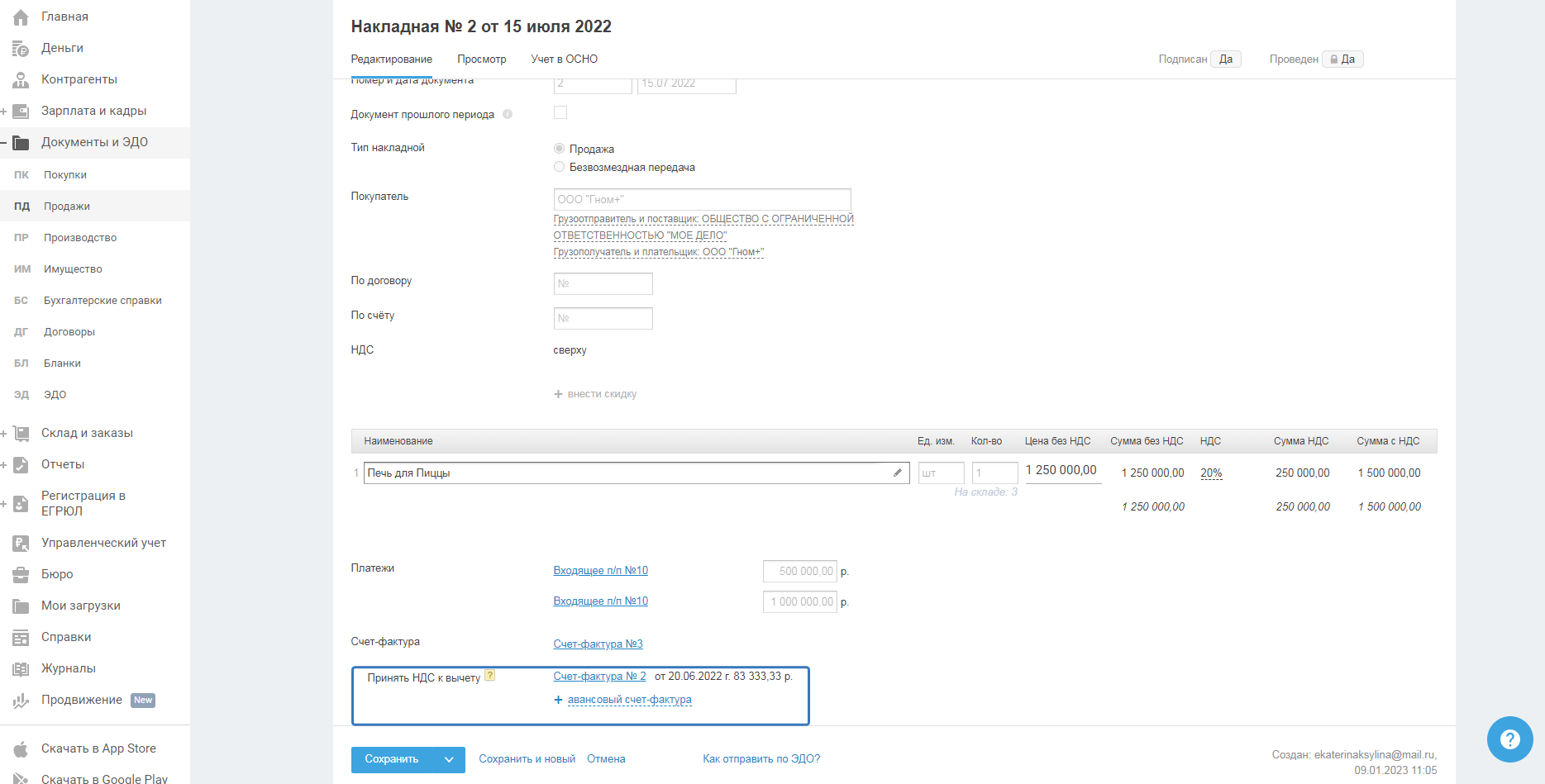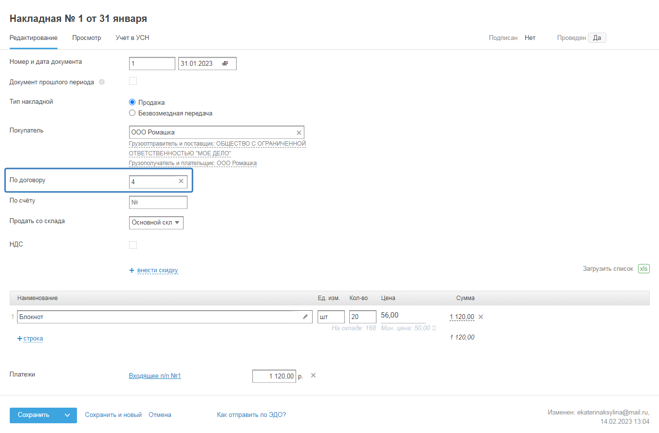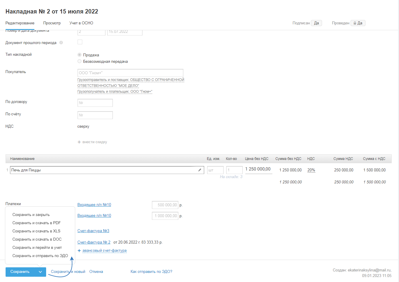 Накладную проще оформить к уже добавленному счёту, т. к. она является закрывающим документом к отгруженному товару. Тогда поля накладной будут заполнены автоматически информацией из счёта. При необходимости вы можете внести изменения.