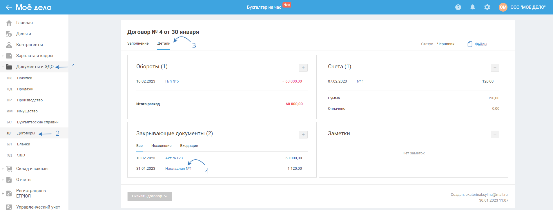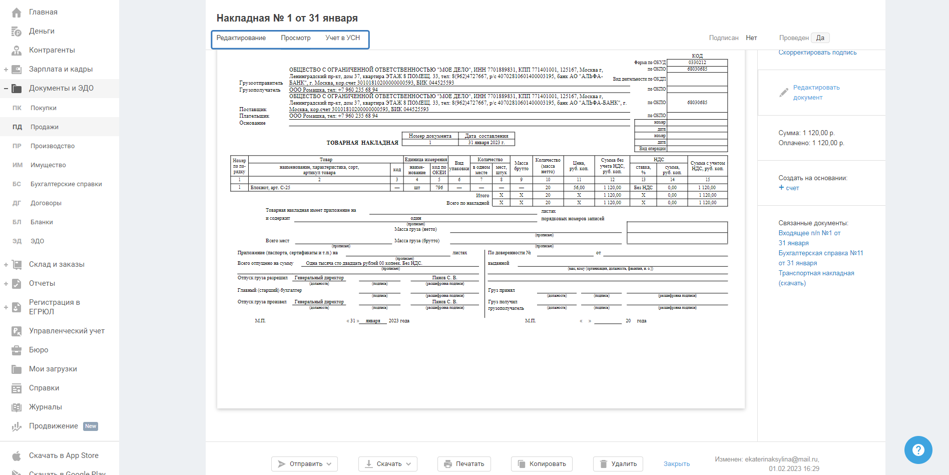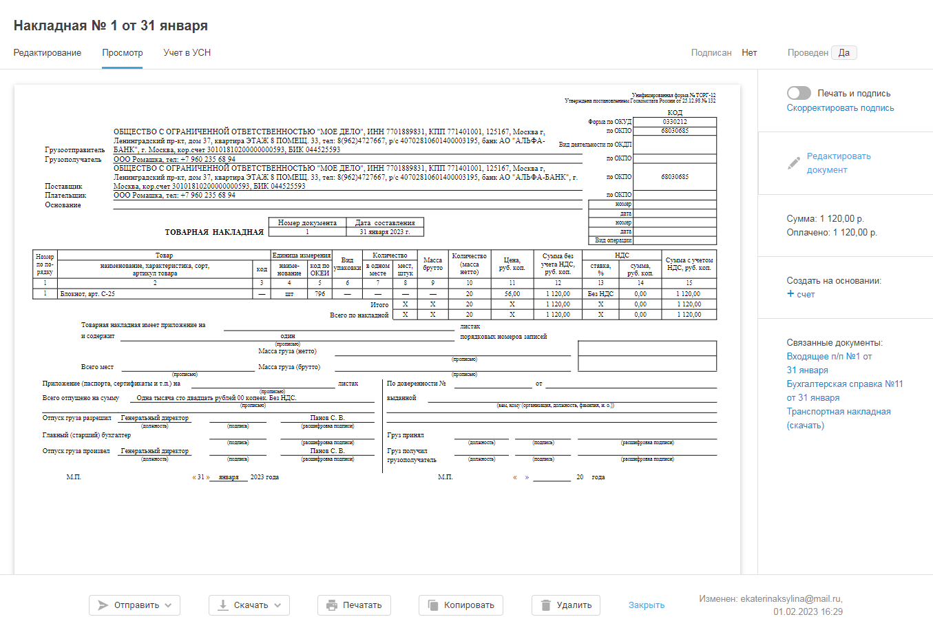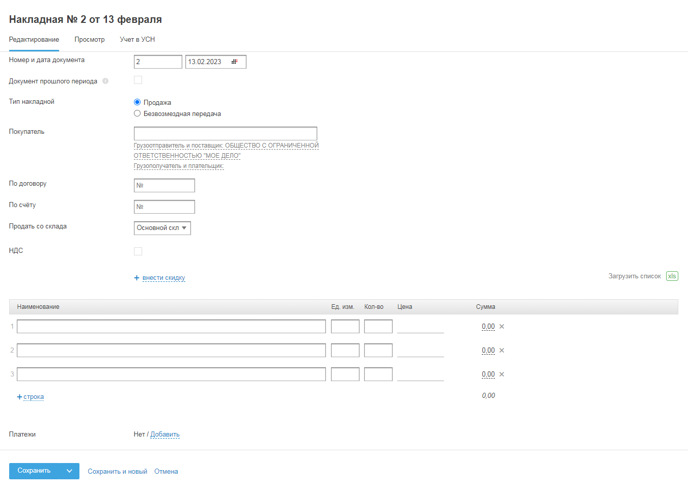 Накладную проще оформить к уже добавленному счёту, т. к. она является закрывающим документом к отгруженному товару. Тогда поля накладной будут заполнены автоматически информацией из счёта. При необходимости вы можете внести изменения.