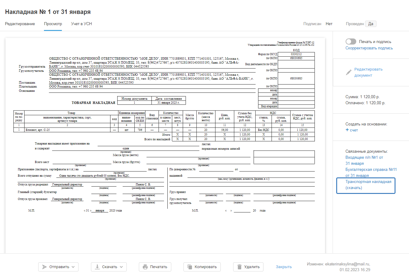 В режиме «Просмотр» есть возможность скачать транспортную накладную:
