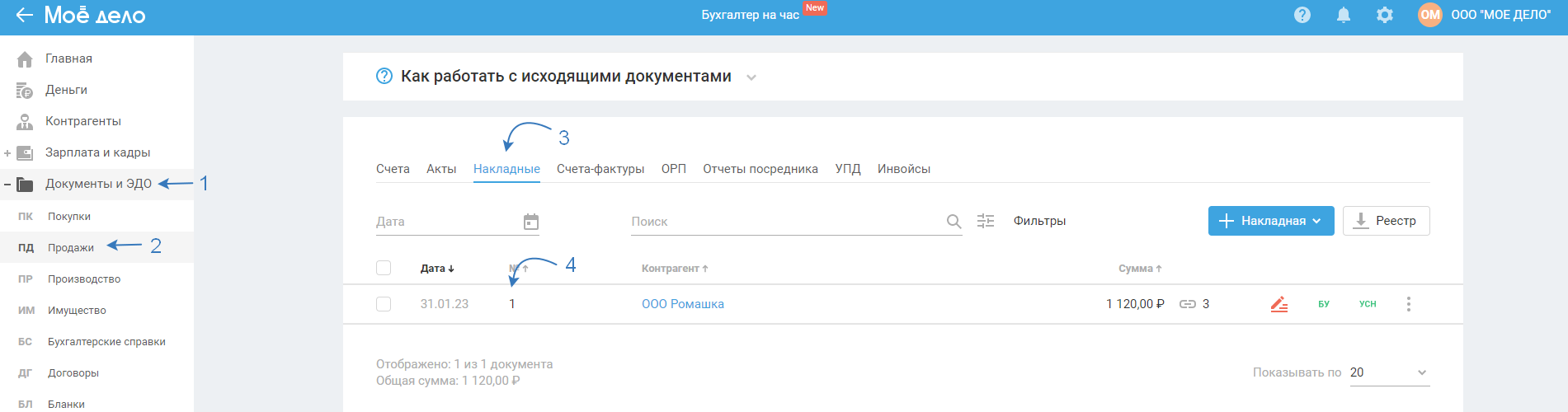 Созданная накладная отражается в таблице созданных документов во вкладке «Накладные»: