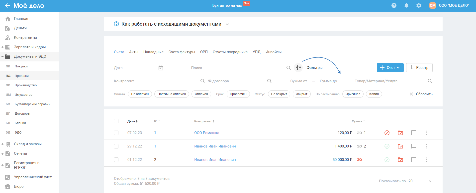 Для быстрого поиска документа вы можете воспользоваться расширенным фильтром, для этого во вкладке «Накладные» нажмите на кнопку «Фильтры» :