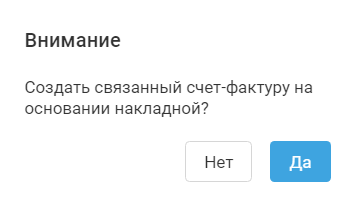В случае, если вы работаете с НДС, то при сохранении накладной сервис предложит создать на её основании счёт-фактуру. Если счёт-фактура был создан ранее, при добавлении накладной (нажатии на кнопку сохранить), появится окно с предложением связать их между собой.