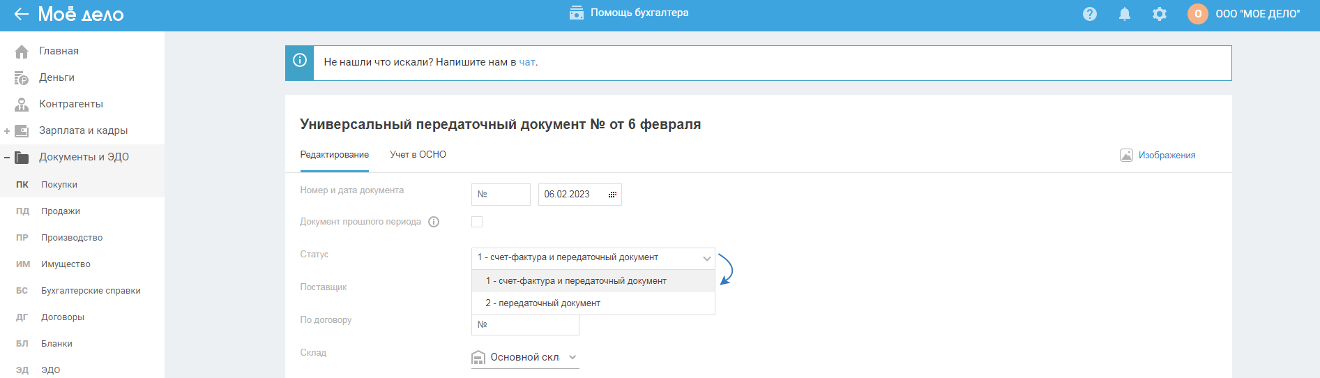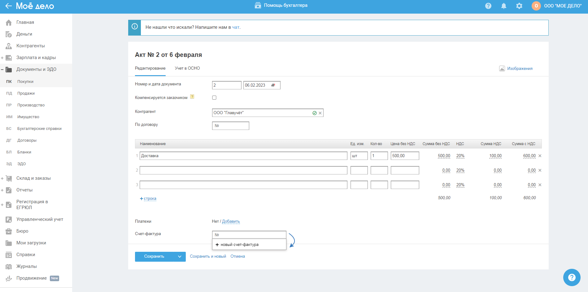 Ссылку «+ счёт-фактура, УПД» используйте для добавления других документов: