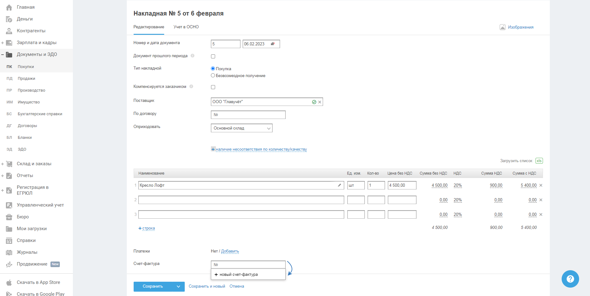 Если поставщик, в счёт поставленных товаров, предоставил накладную, то при создании накладной на покупку поле «Счёт-фактура» выберите «плюс новый счёт-фактура»: