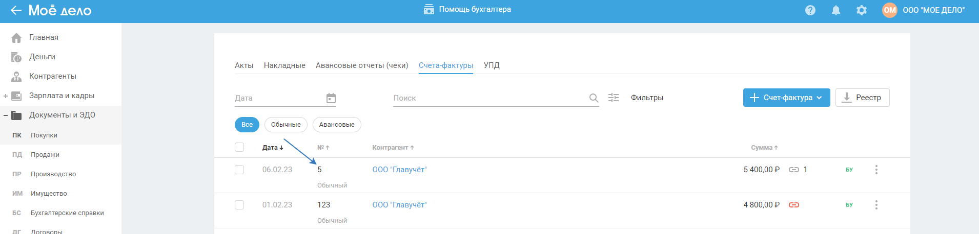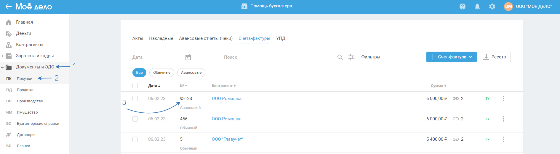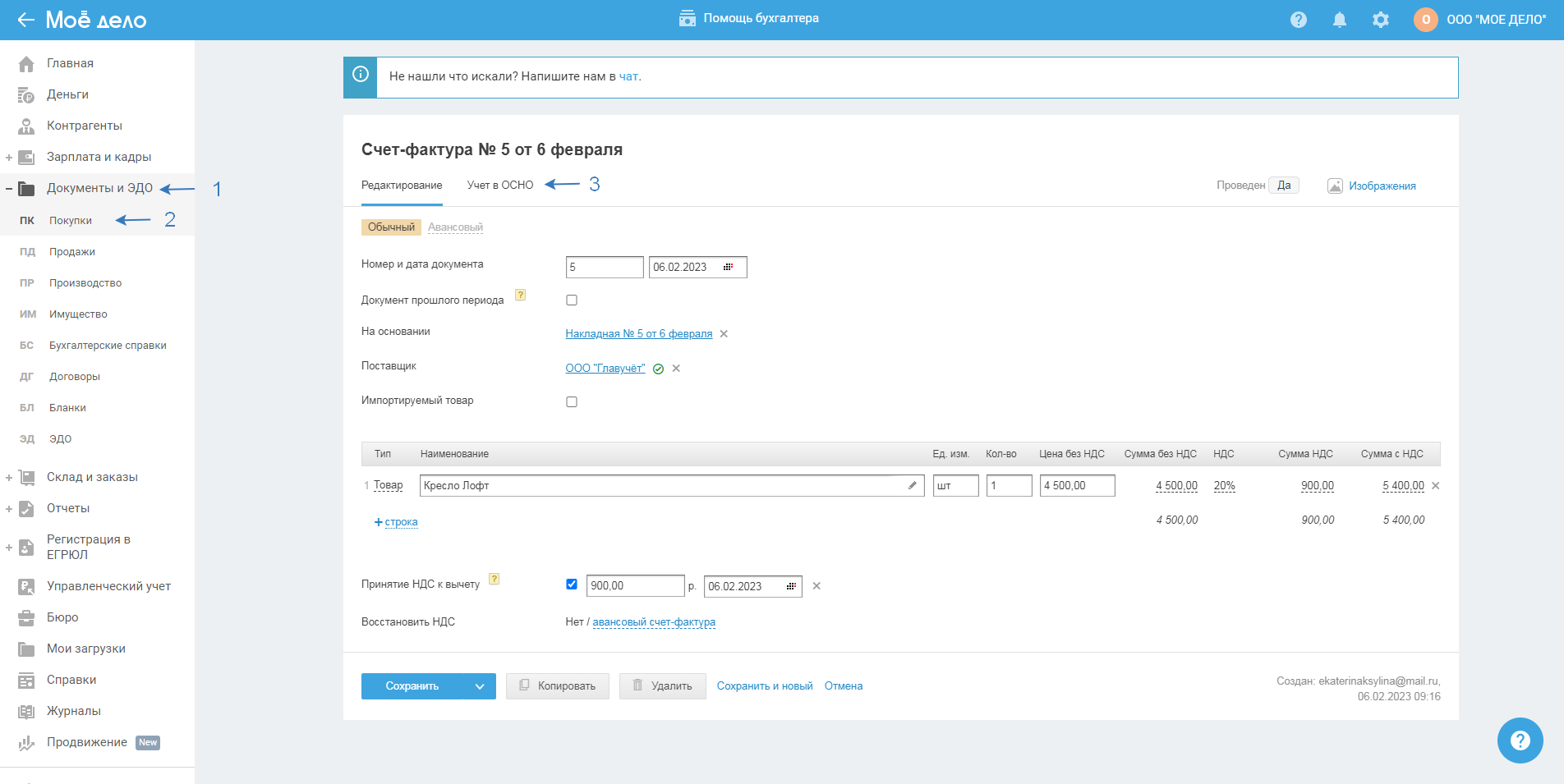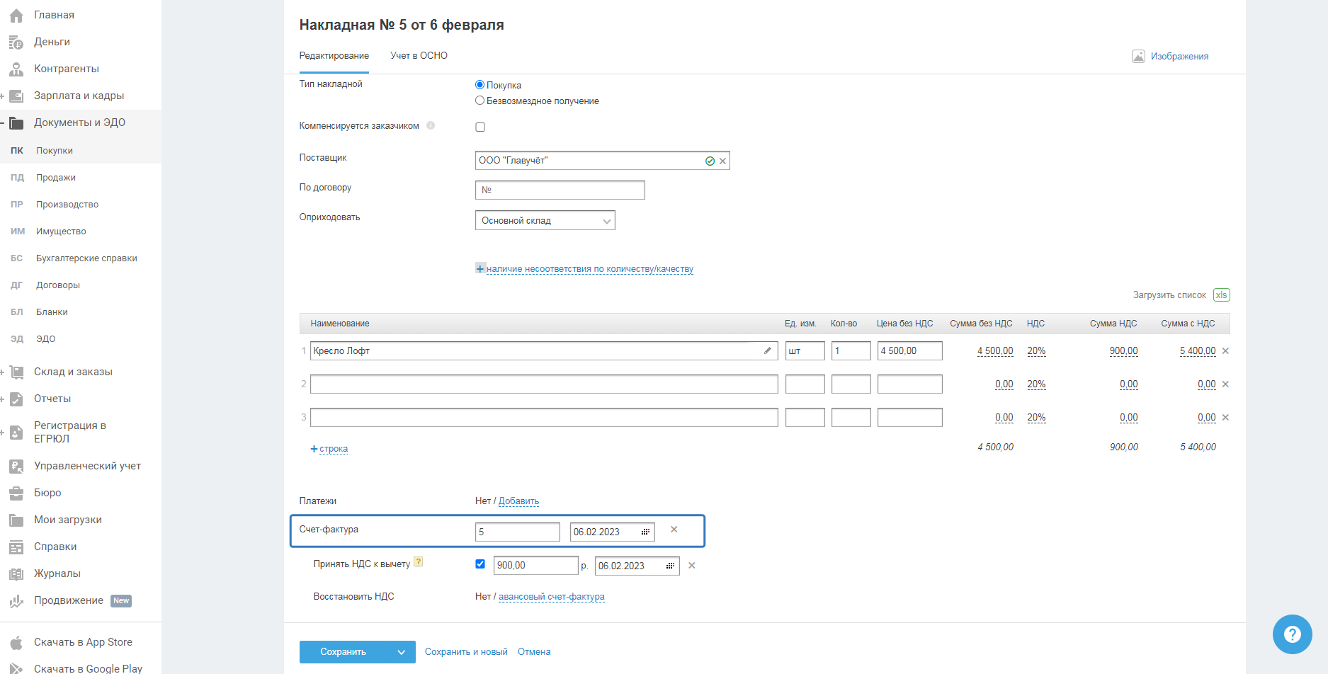 После сохранения акта (накладной) счёт-фактура сформируется автоматически в разделе «Документы и ЭДО — Покупки — Счета-фактуры»: