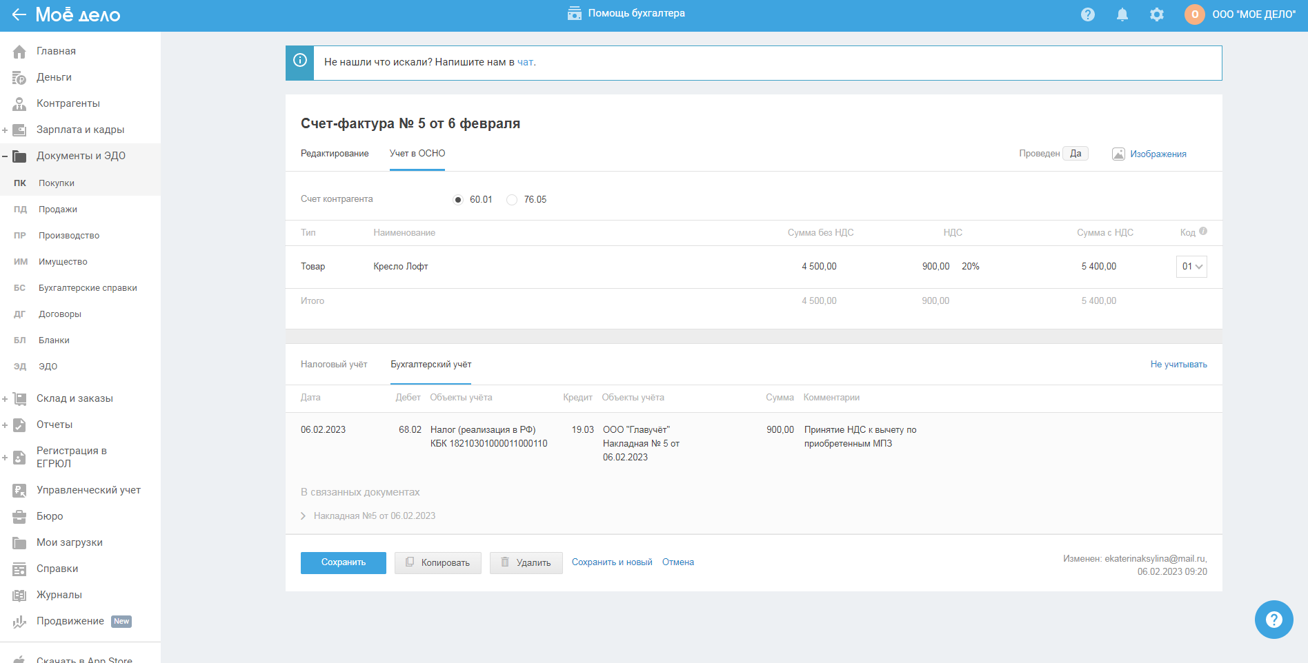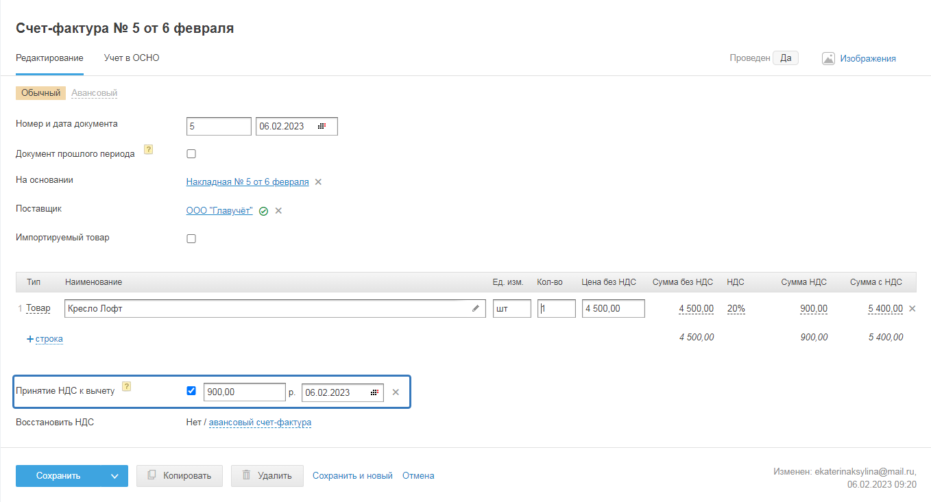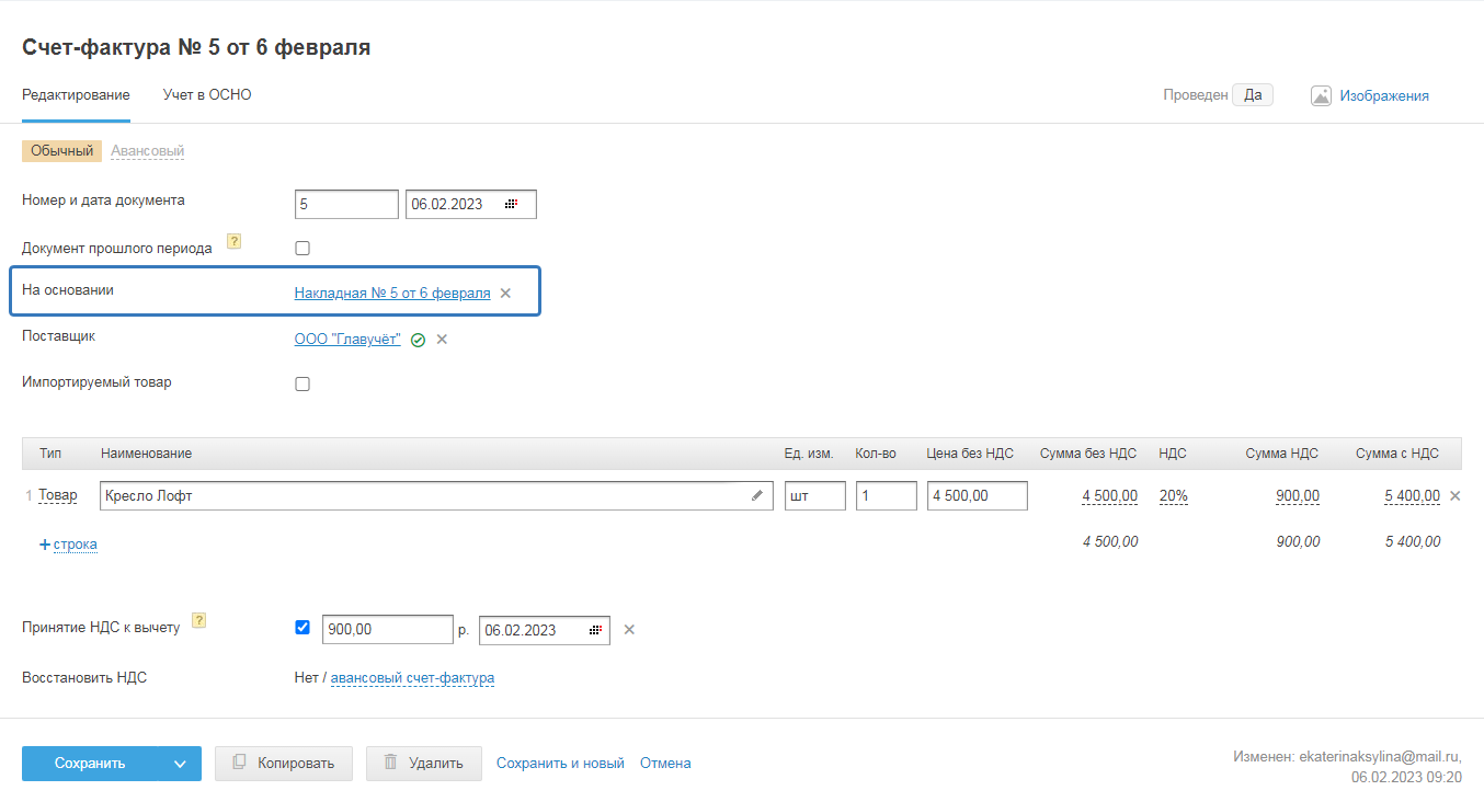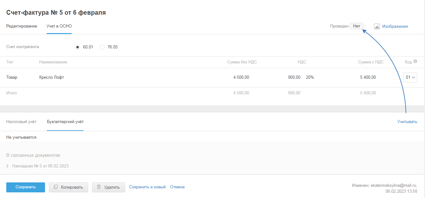 И после сохранения счёта-фактуры изменится статус документа c «да» на «нет»: