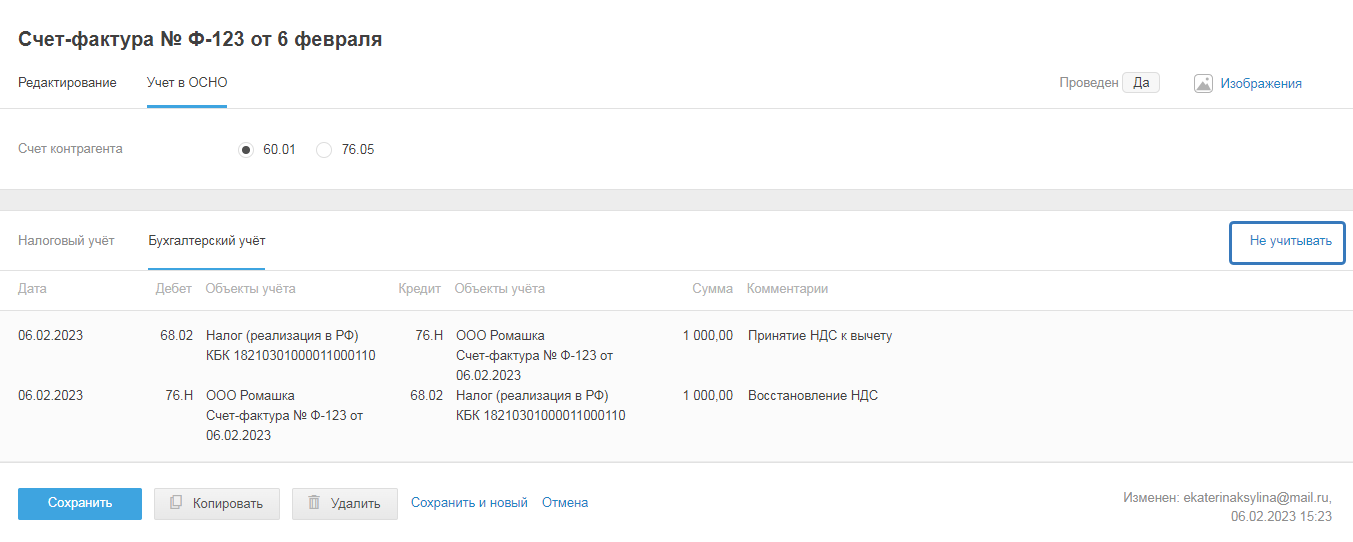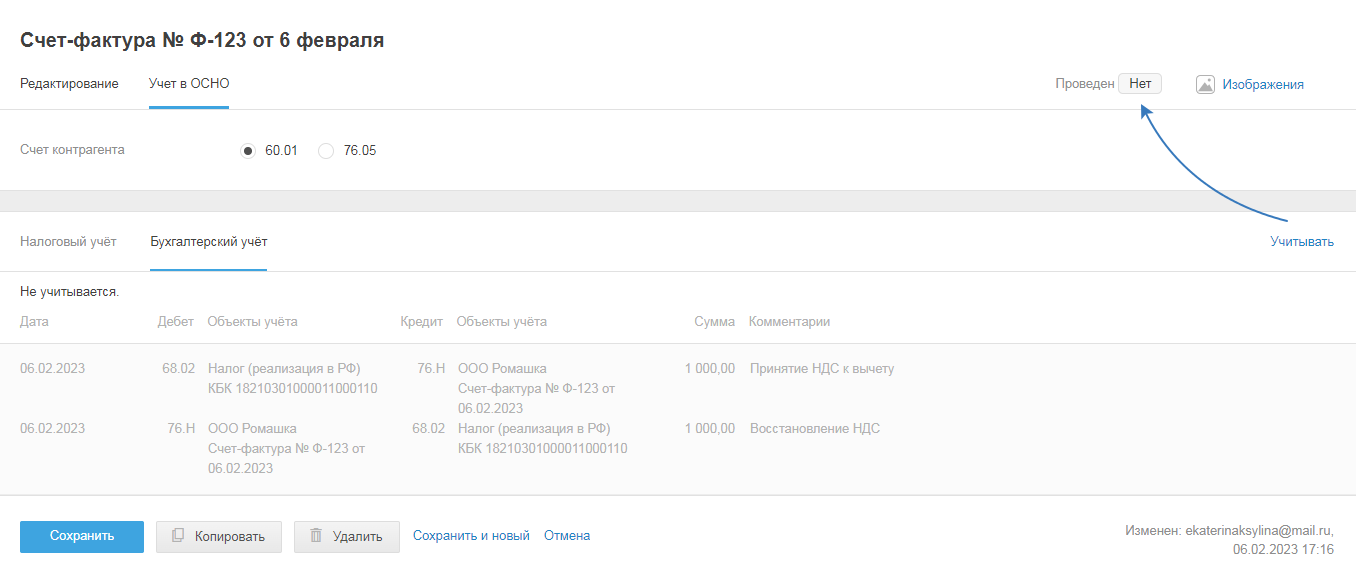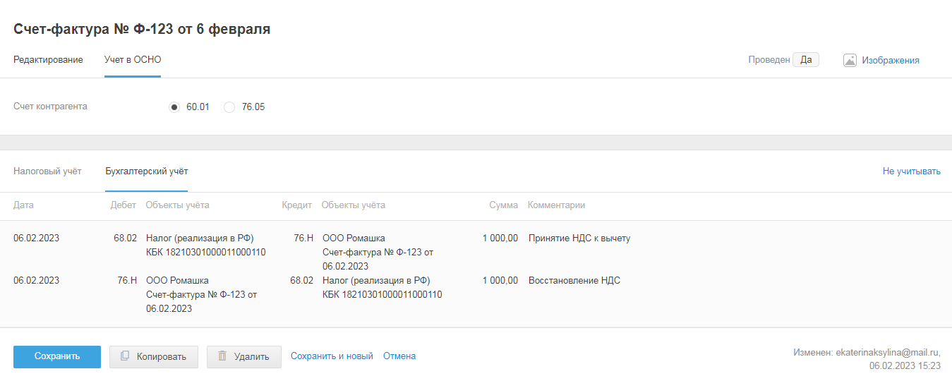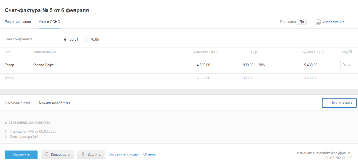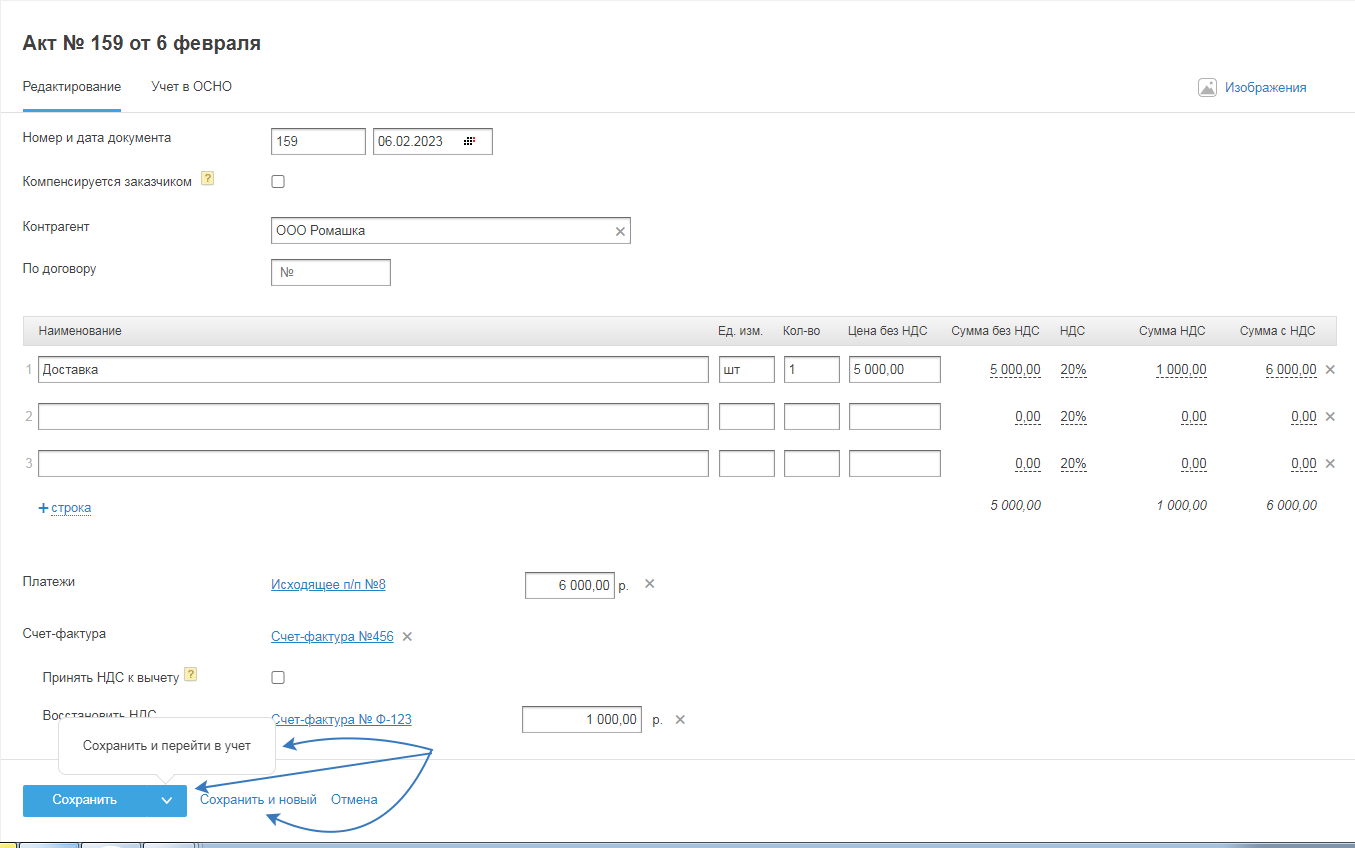 - Сохранить и перейти в учёт — чтобы перейти в режим учёта и посмотреть, как акт проведён в бухгалтерском и налоговом учетах.