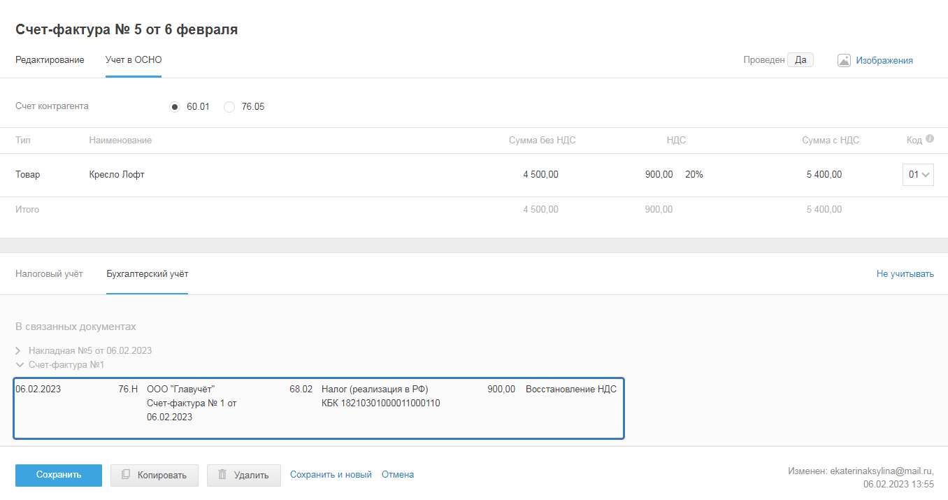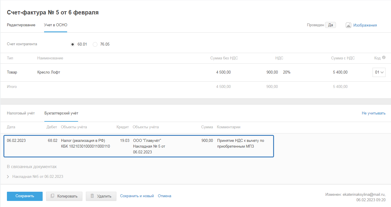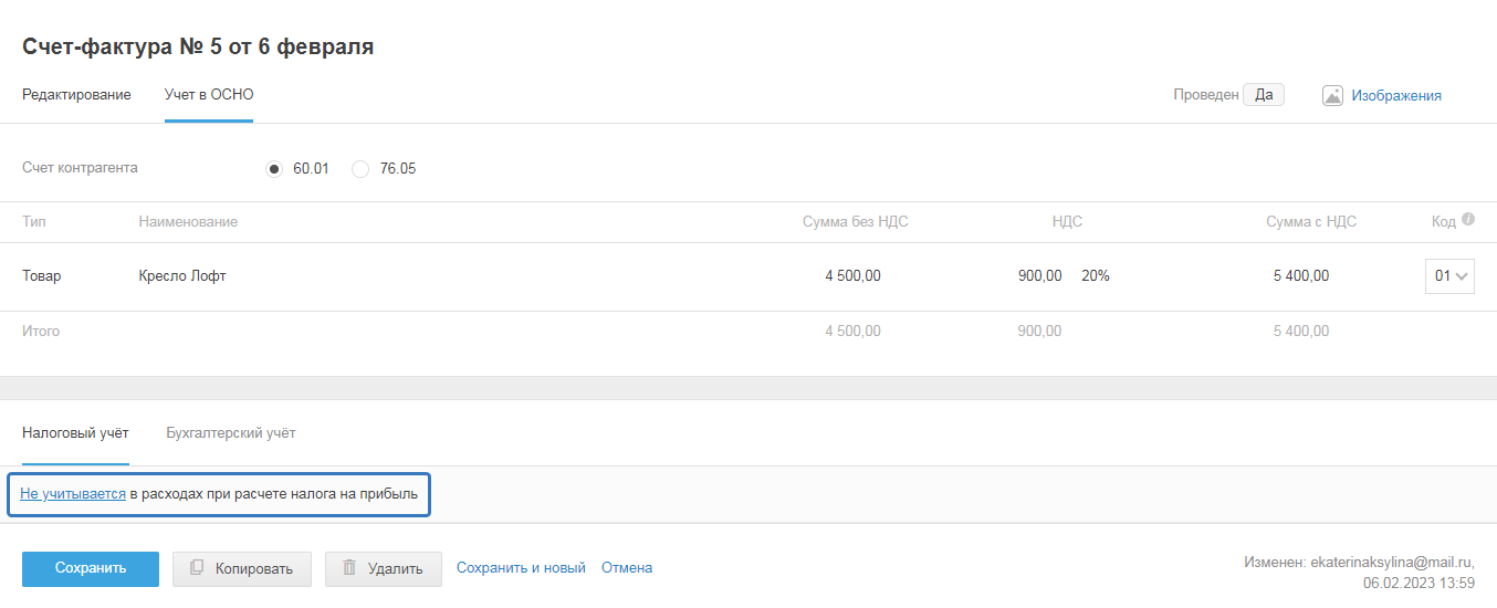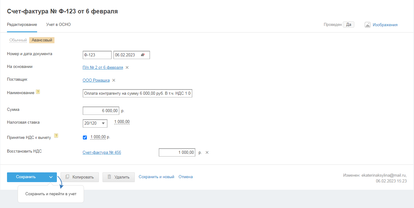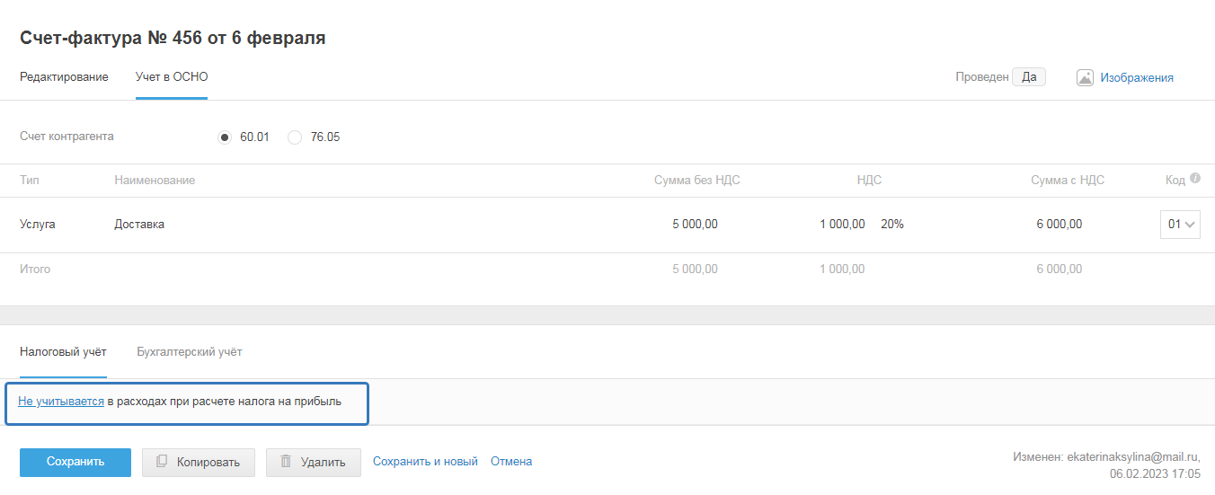 - Сохранить и перейти в учёт — чтобы перейти в режим учёта и посмотреть, как акт проведён в бухгалтерском и налоговом учетах.