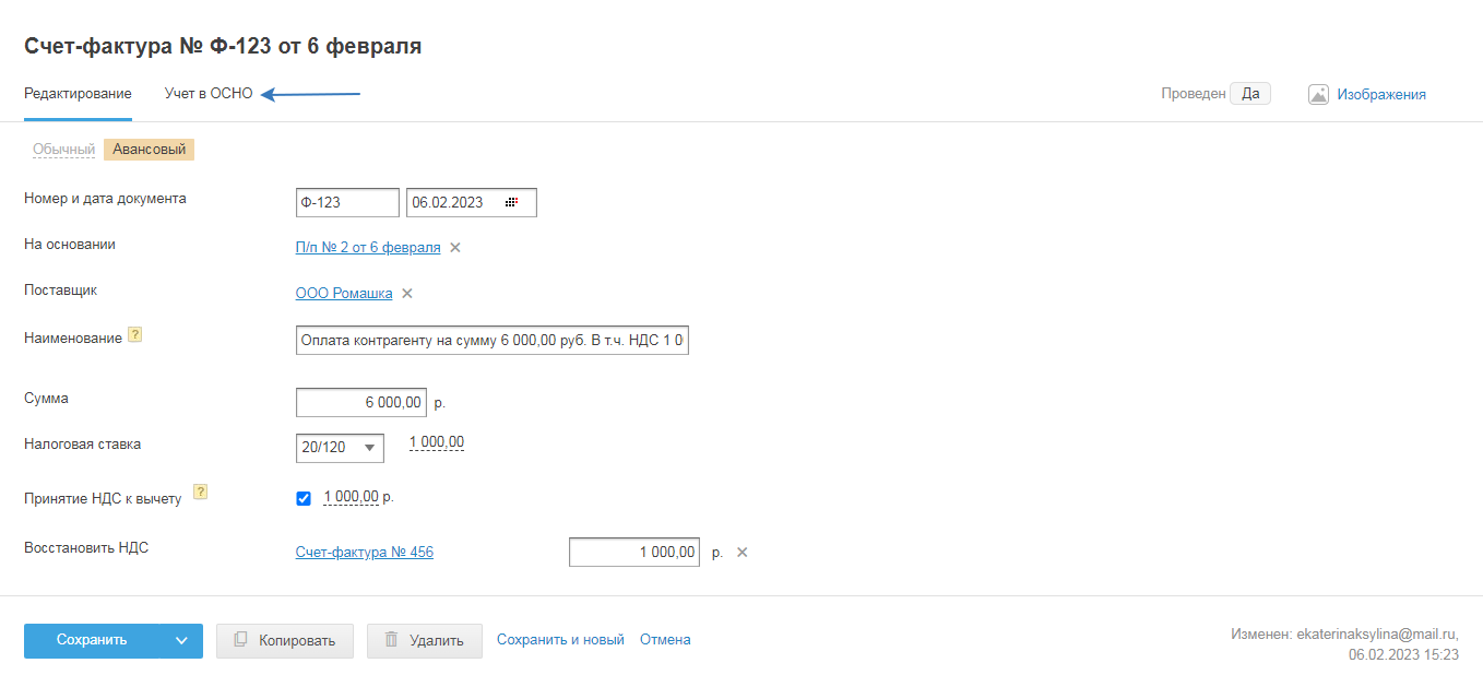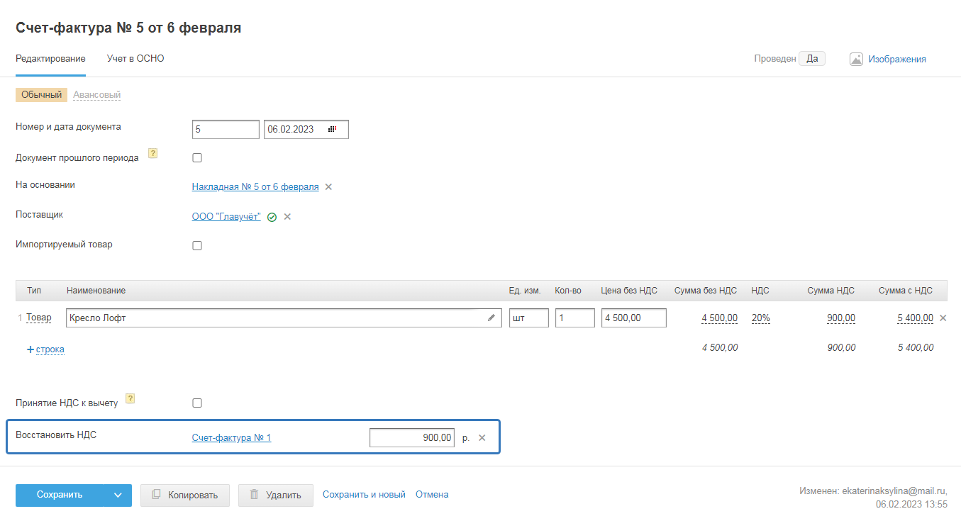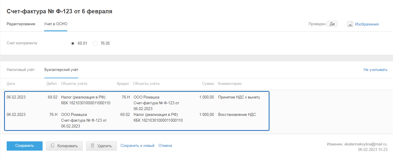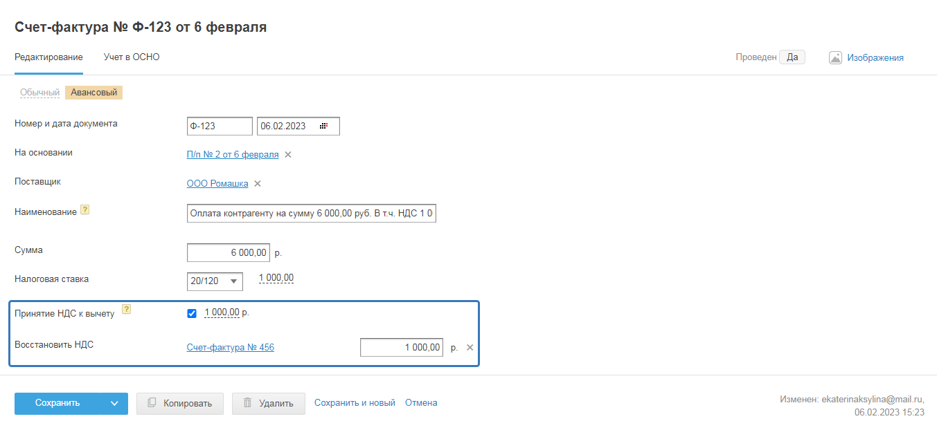 Вторая проводка «Восстановление НДС» формируется, когда во вкладке «Редактирование» есть связь с обычным счётом-фактурой: