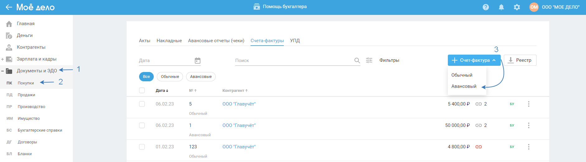 Счета-фактуры, полученные от поставщиков, необходимо отразить в сервисе.