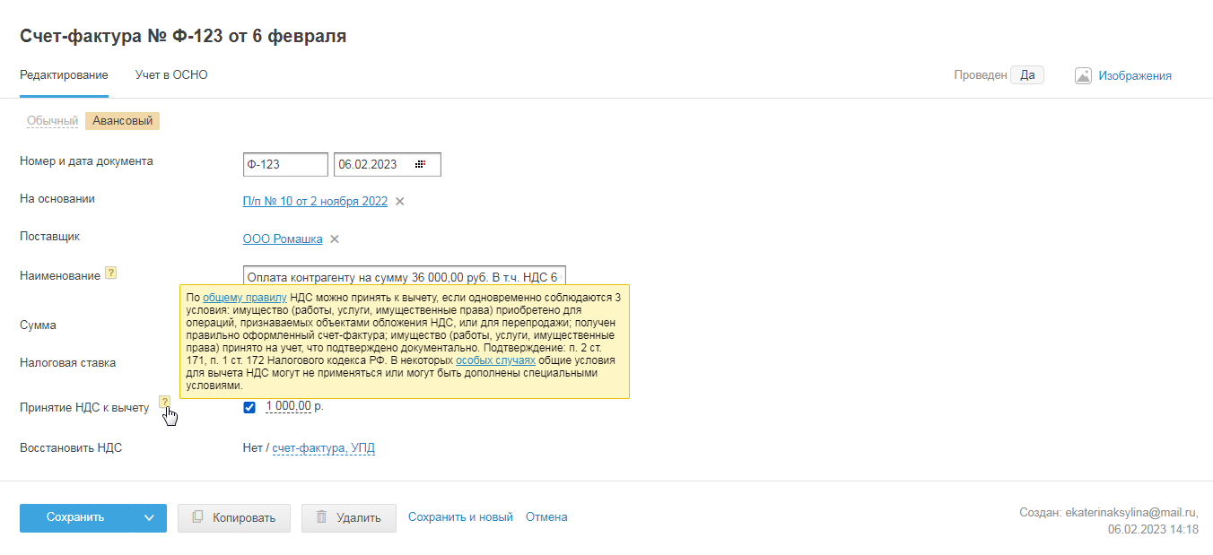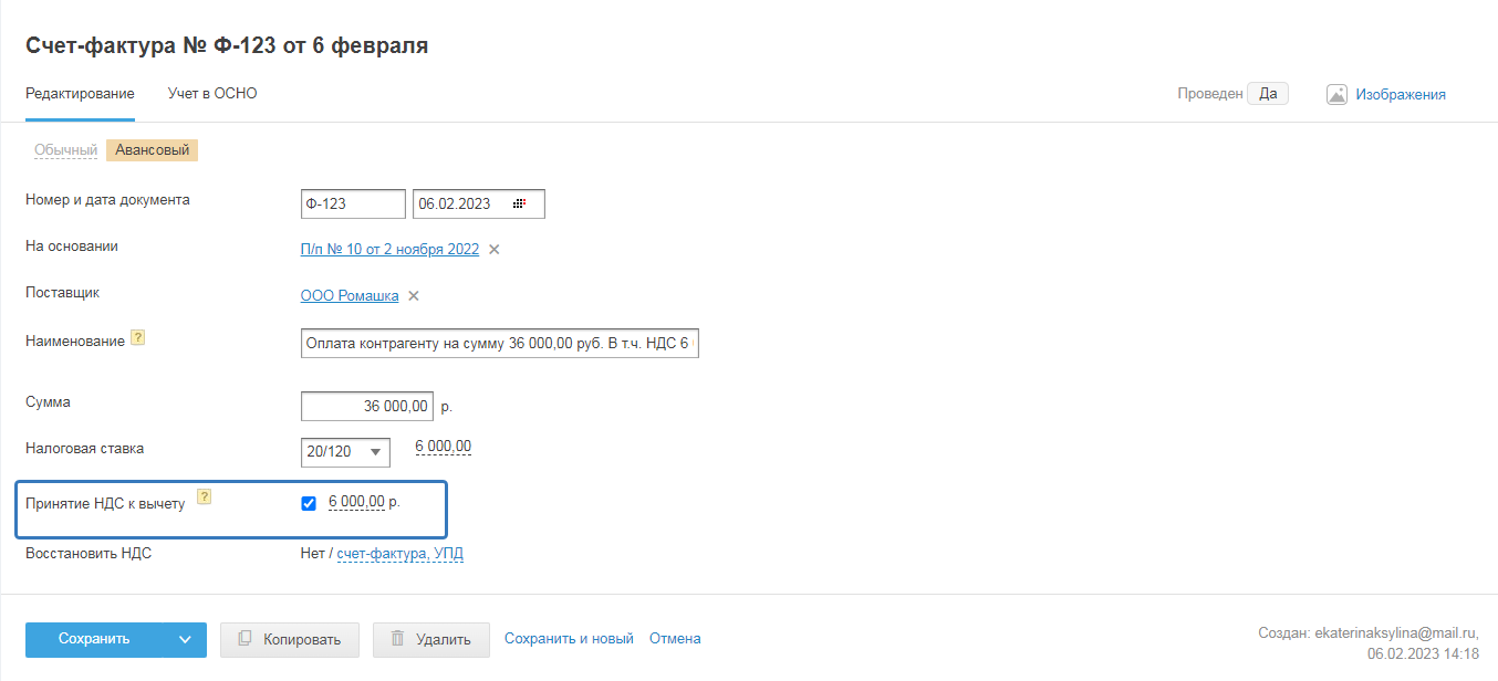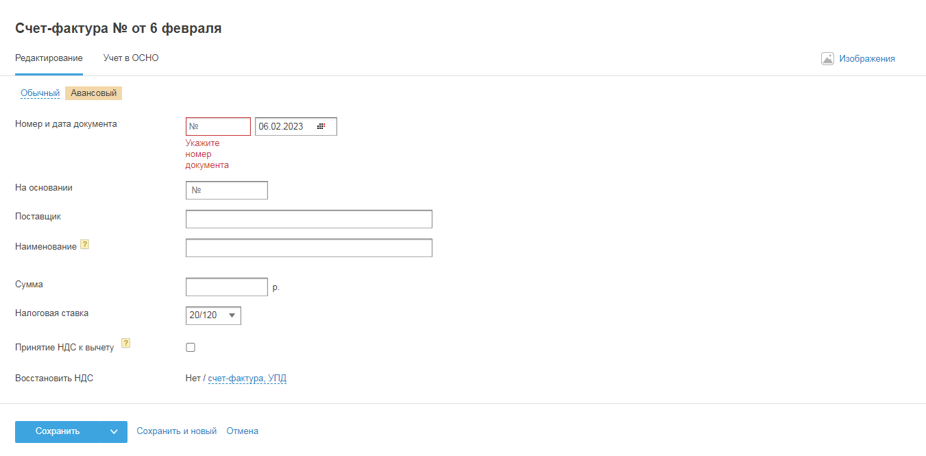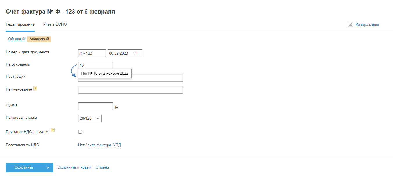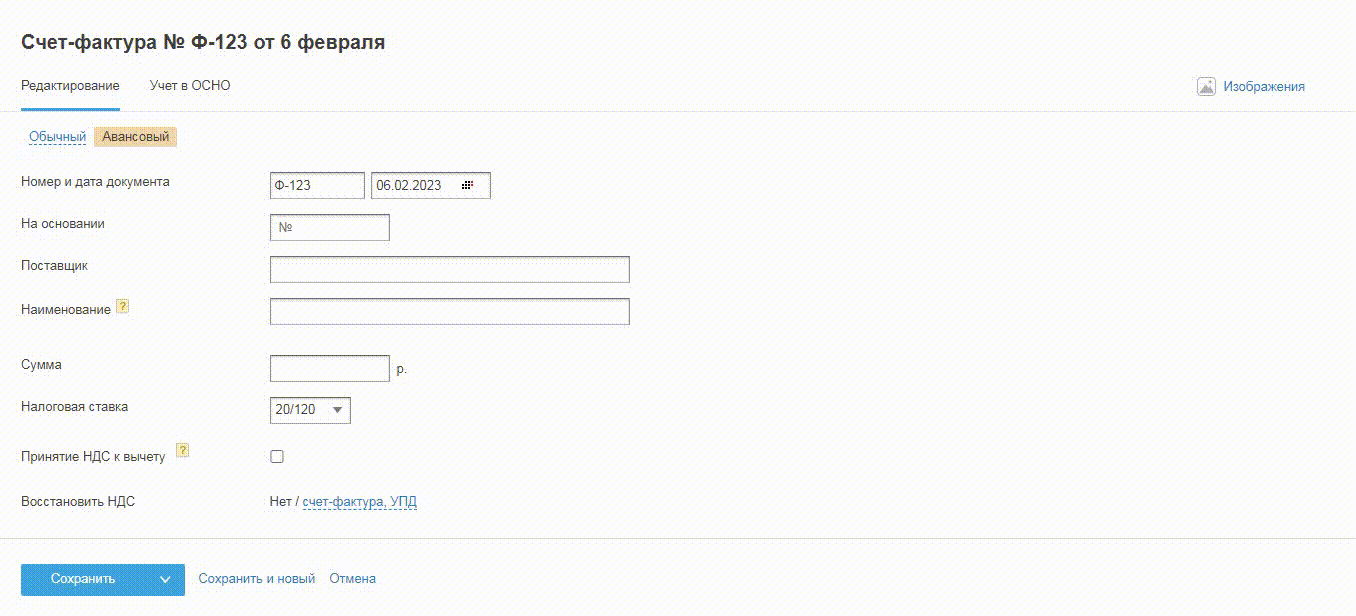 Получив от поставщика обычный счёт-фактуру, укажите его номер и дату при создании документа, по которому получены товары, работы, услуги (акт, накладная).