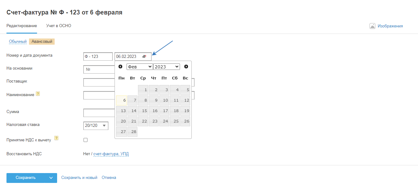 Перейти во вкладку «Учёт» можно при создании авансового счёт-фактуры после заполнения всех необходимых полей, для этого нажмите на кнопку «Сохранить и перейти в учёт»: