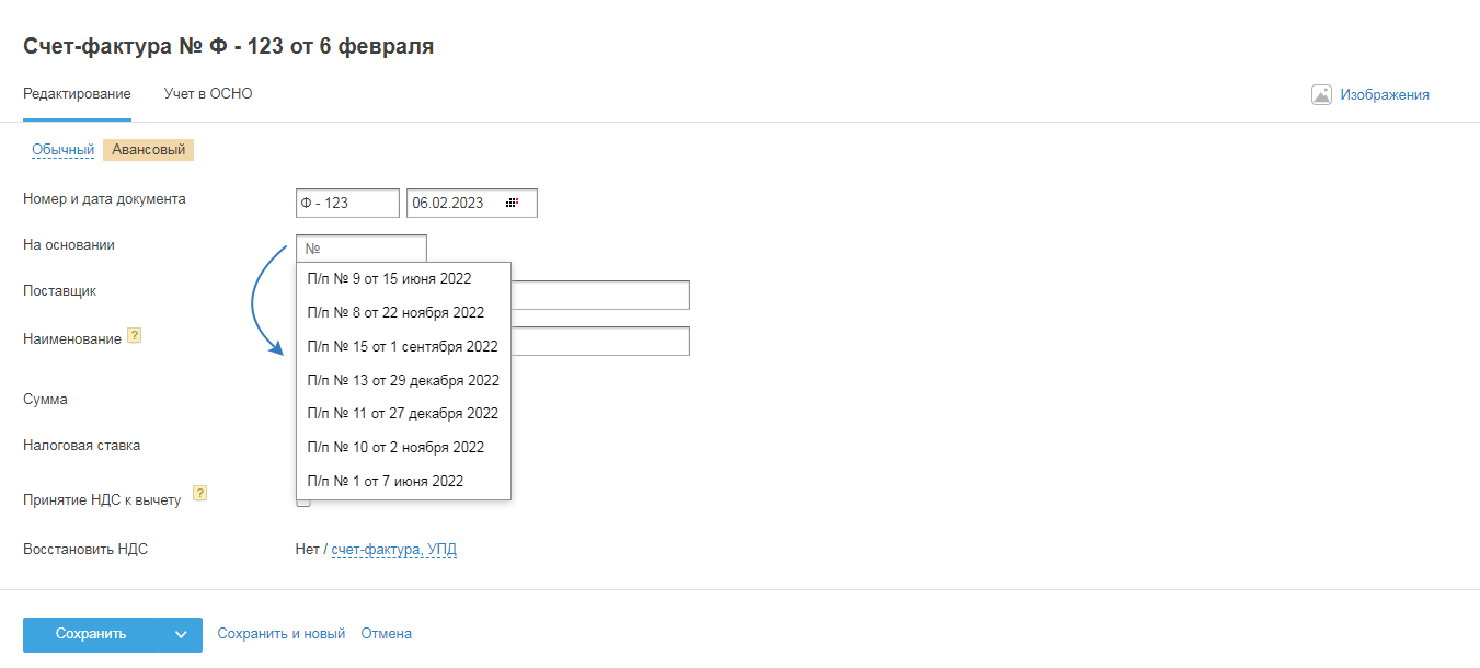 В выпадающем списке будут доступны счета-фактуры и УПД, в которых указан тот же поставщик, что и в авансовом счёте-фактуре, и по которым НДС восстановлен не полностью, т.е. в строке «восстановить НДС» в форме обычного счёта-фактуры или УПД указана сумма меньшая, чем сумма НДС в самом документе.