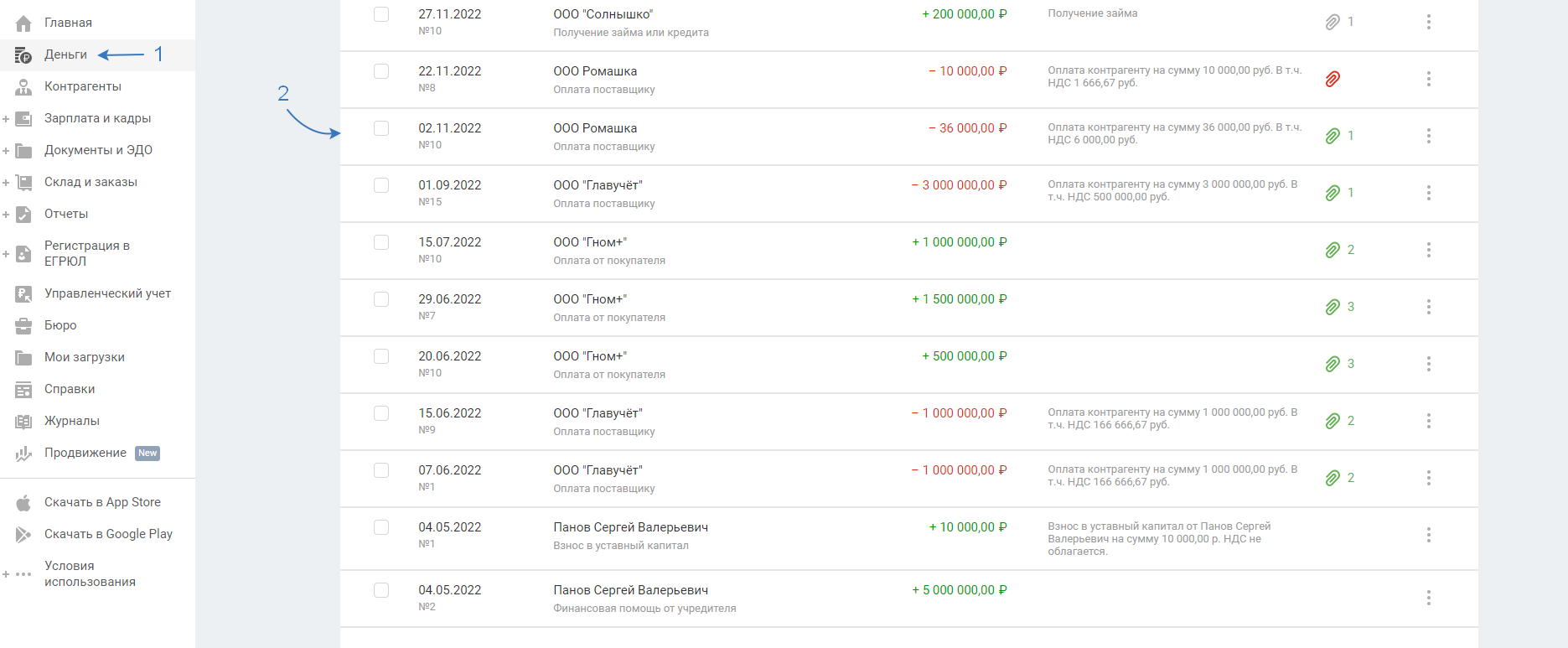 Чтобы появилась возможность выбора, документ должен быть предварительно создан в разделе «Деньги»: