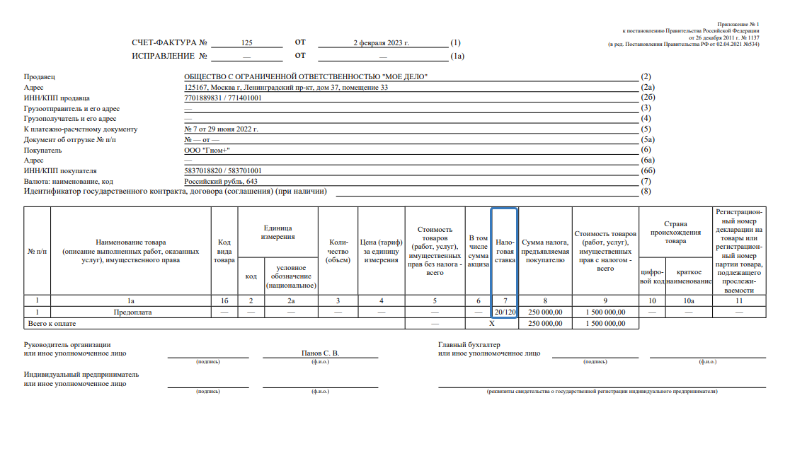 3) Сумма без НДС; Сумма и ставка НДС; Сумма с НДС — заполняются автоматически;