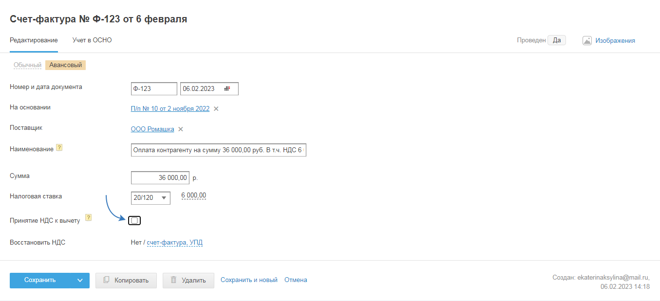 2. При создании документа на покупку, на основании которого принимаете товар, работу, услугу к учёту (акт, накладная, УПД).