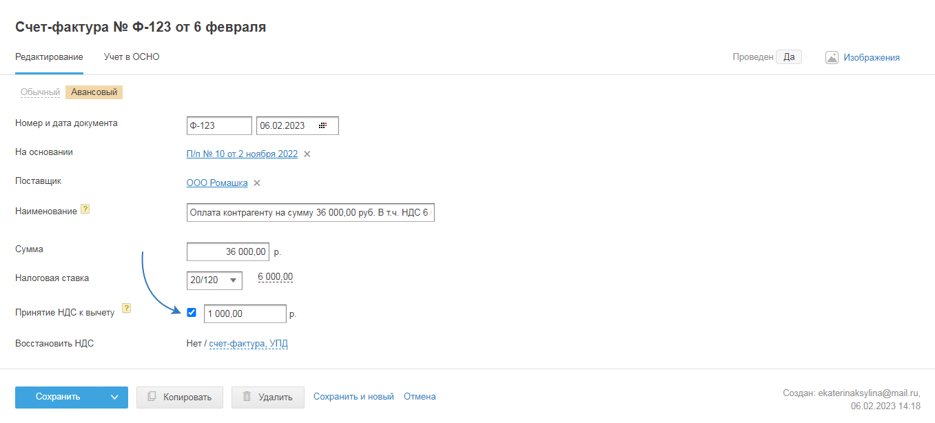 Если налог нужно уменьшить, но не на всю сумму перечисленного НДС, тогда измените значение суммы налога к вычету: