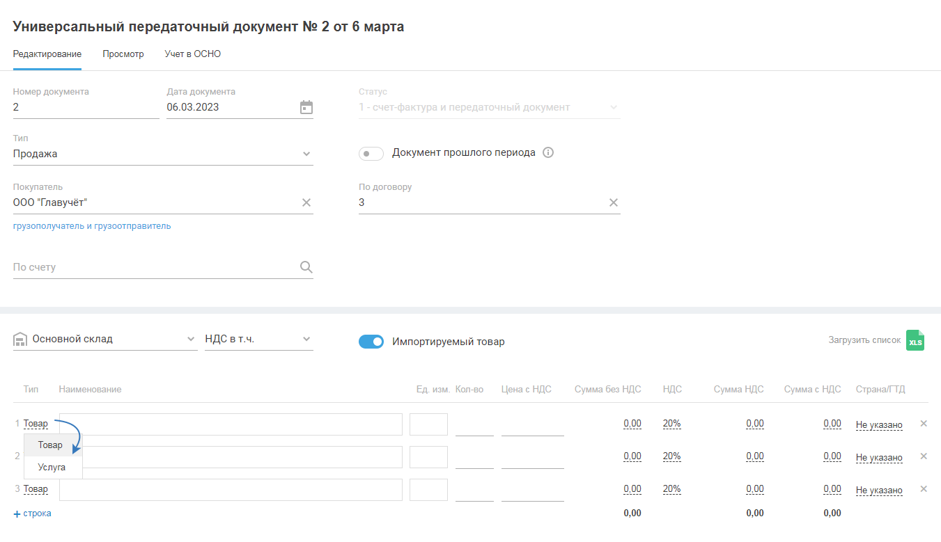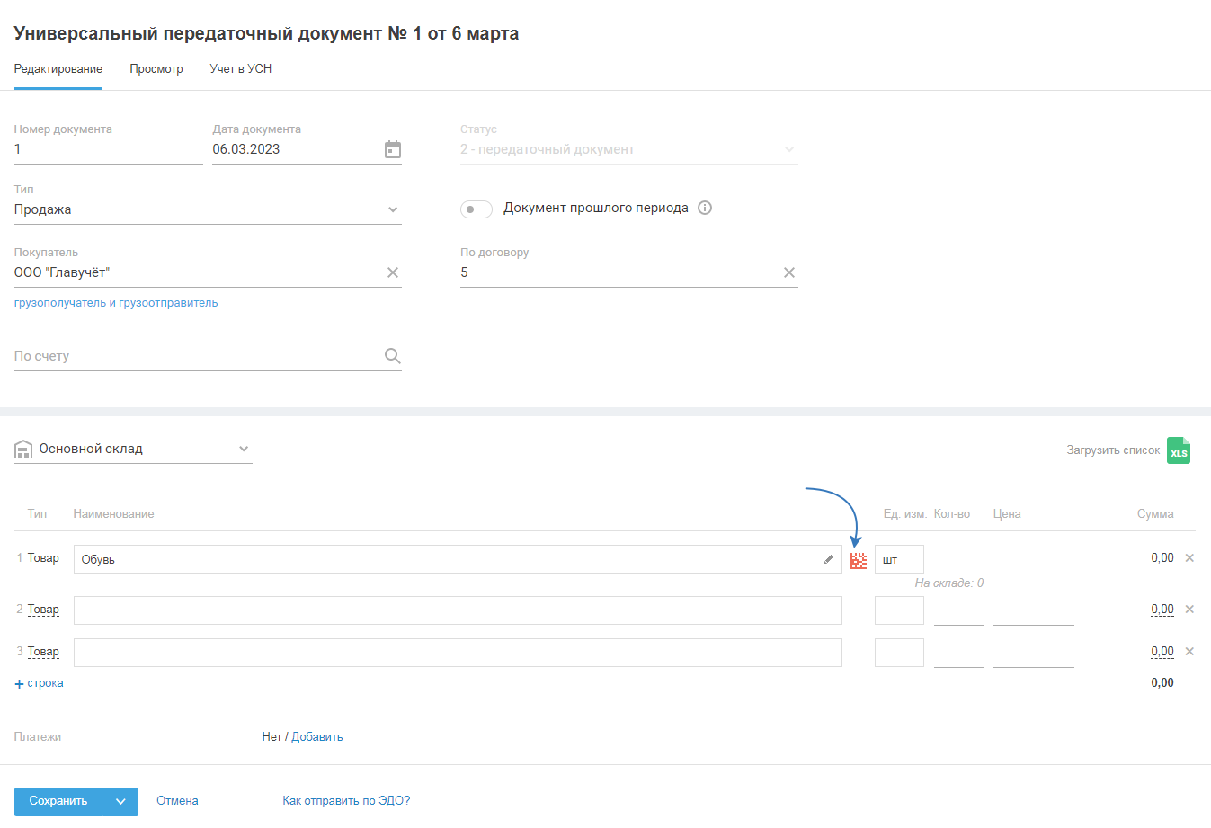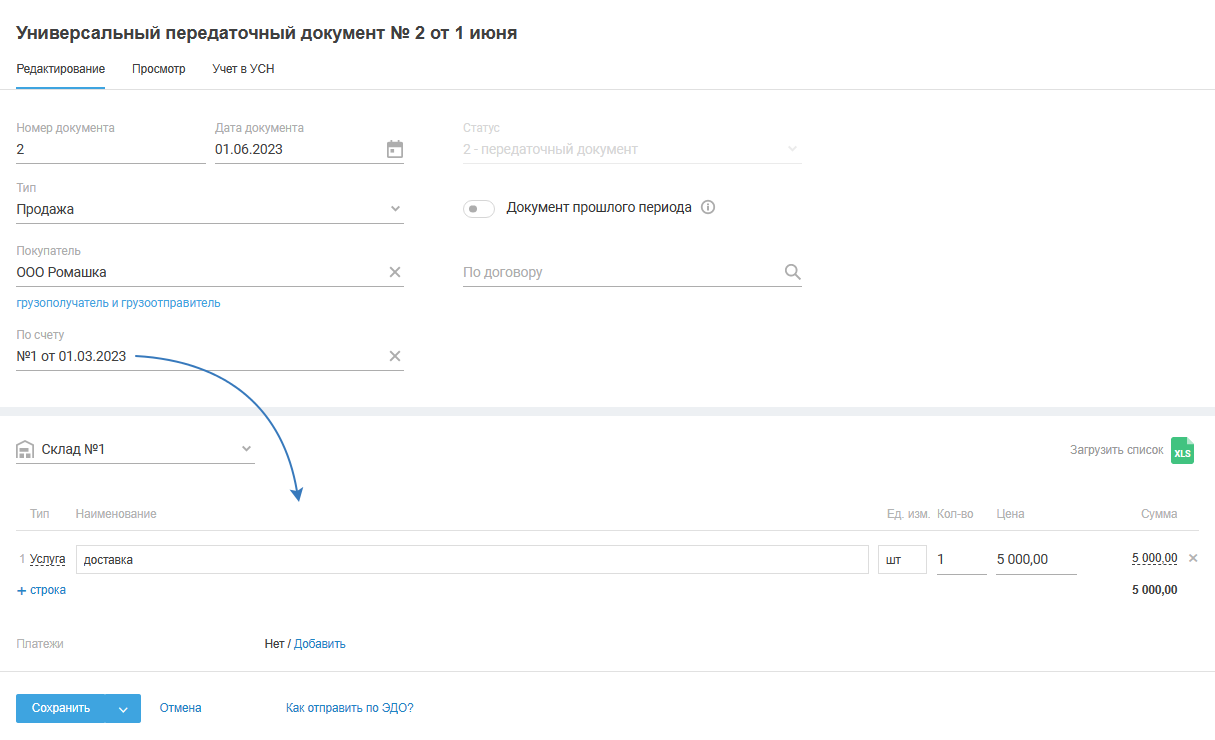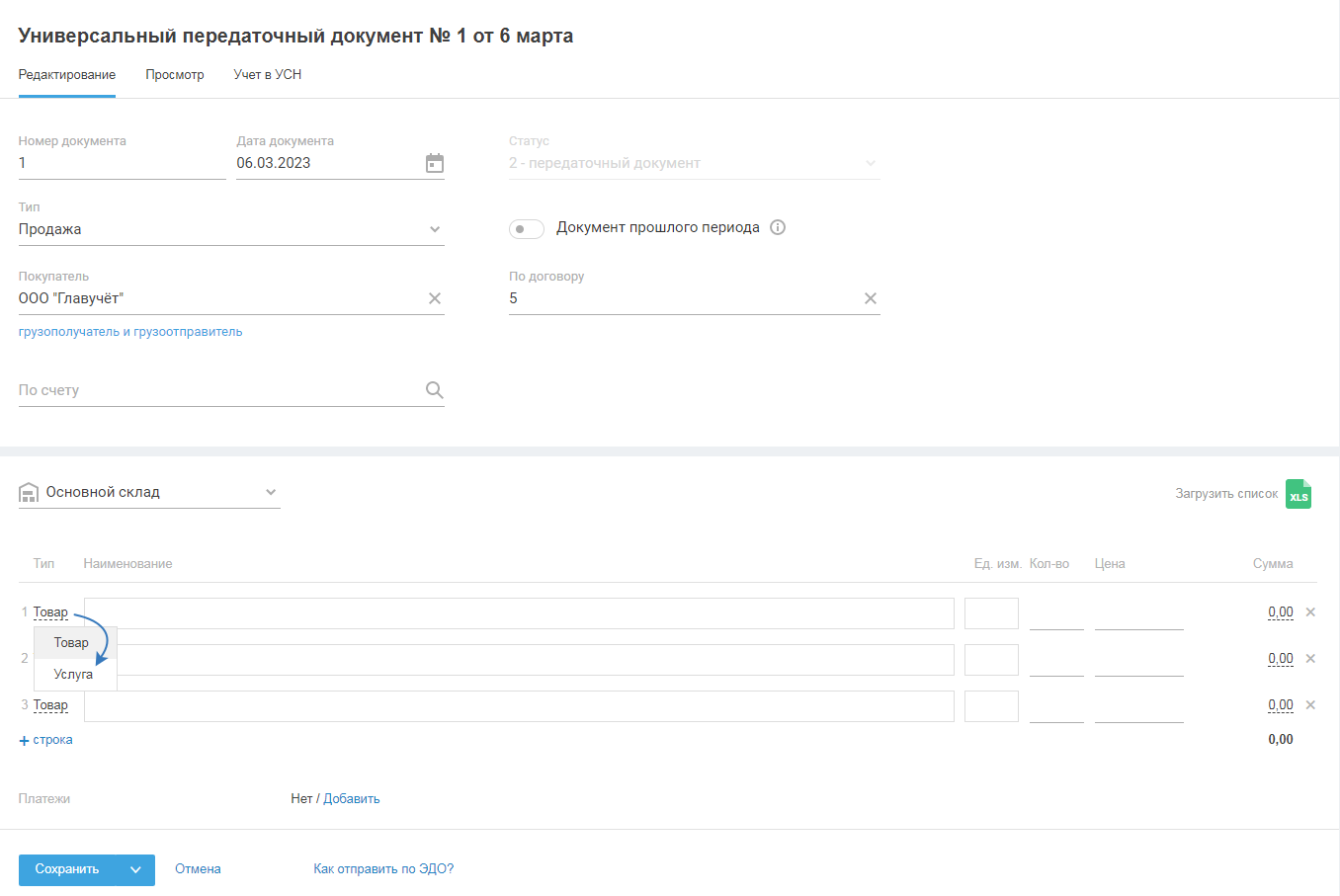 Таблица с позициями — в поле для заполнения позиций указать тип (товар или услуга) и наименование. Если выбран счёт, по которому выставляется УПД, то позиции заполнятся автоматически из счёта.