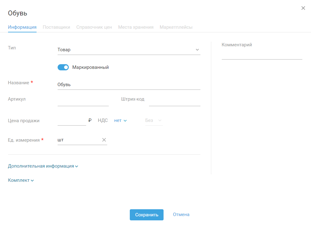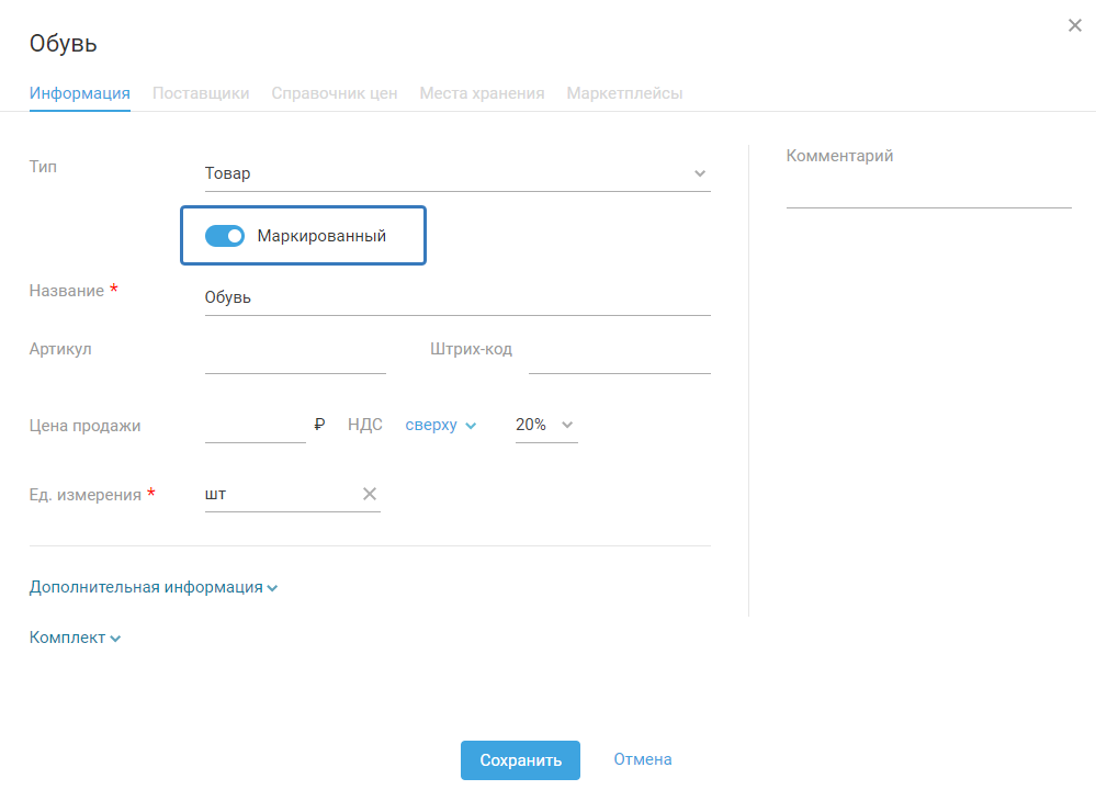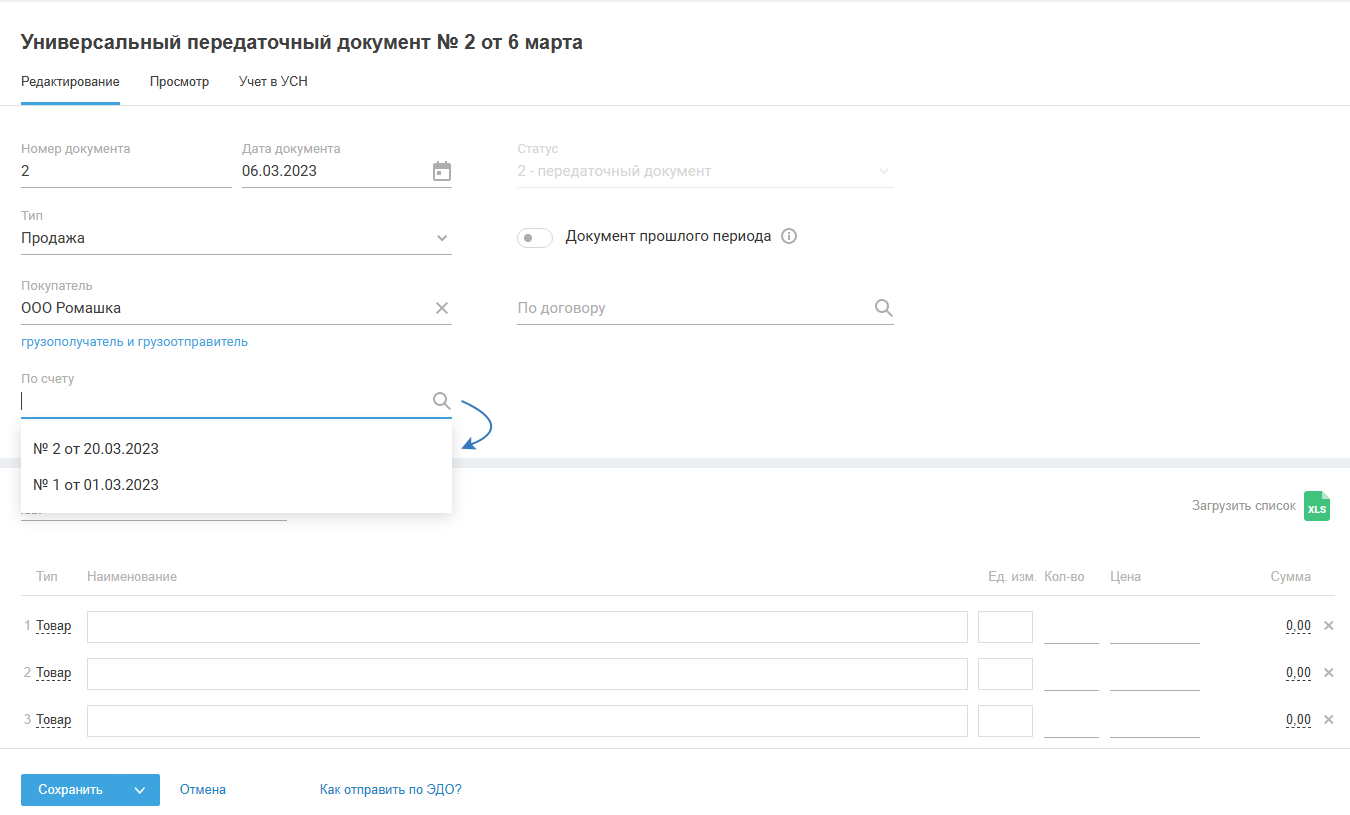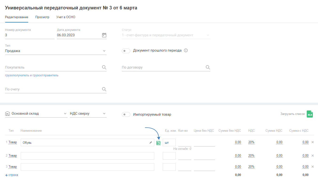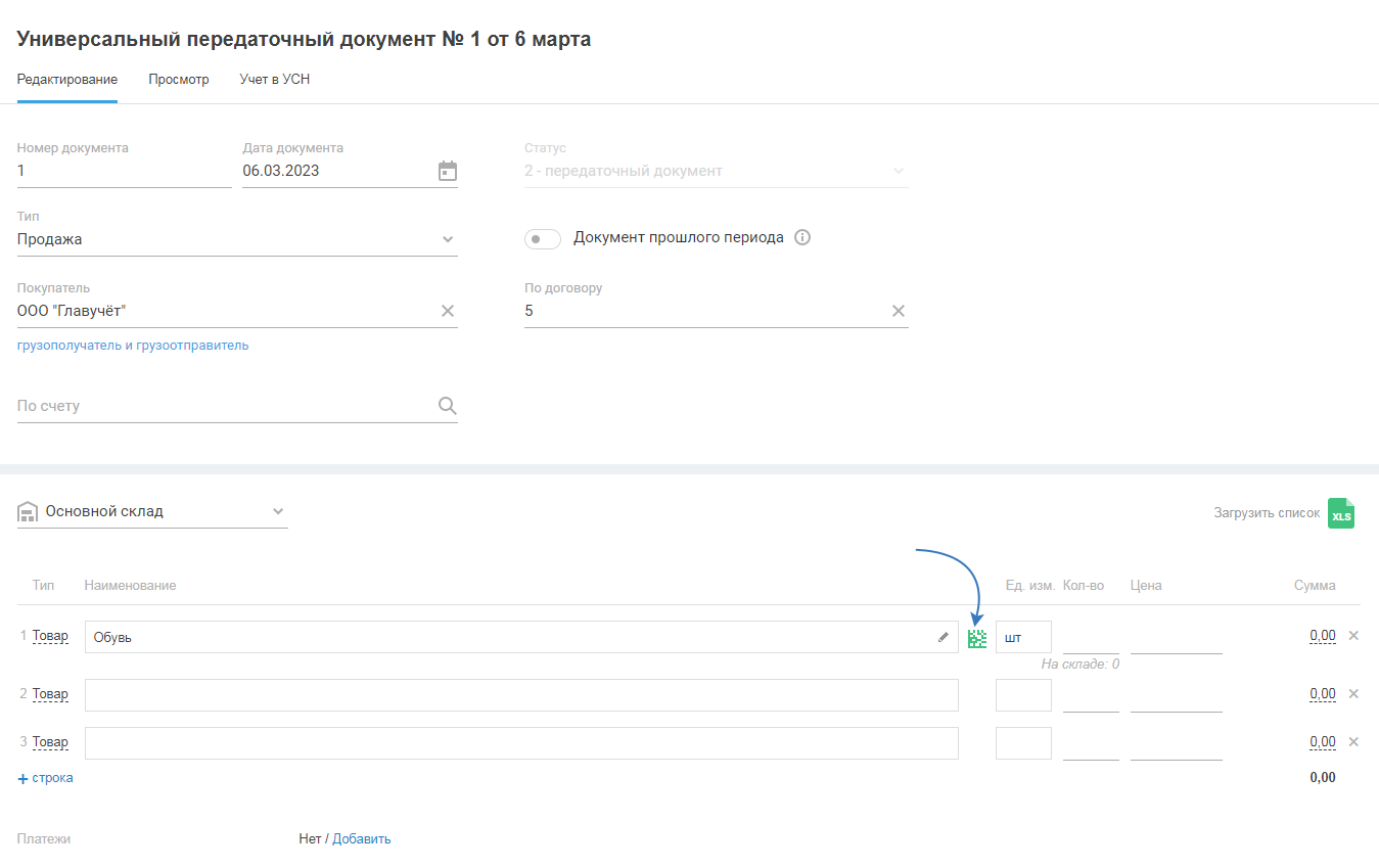 Таблица с позициями — в поле для заполнения позиций указать тип (товар или услуга) и наименование. Если выбран счёт, по которому выставляется УПД, то позиции заполнятся автоматически из счёта.