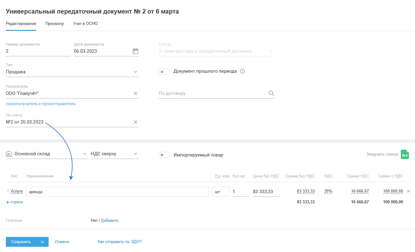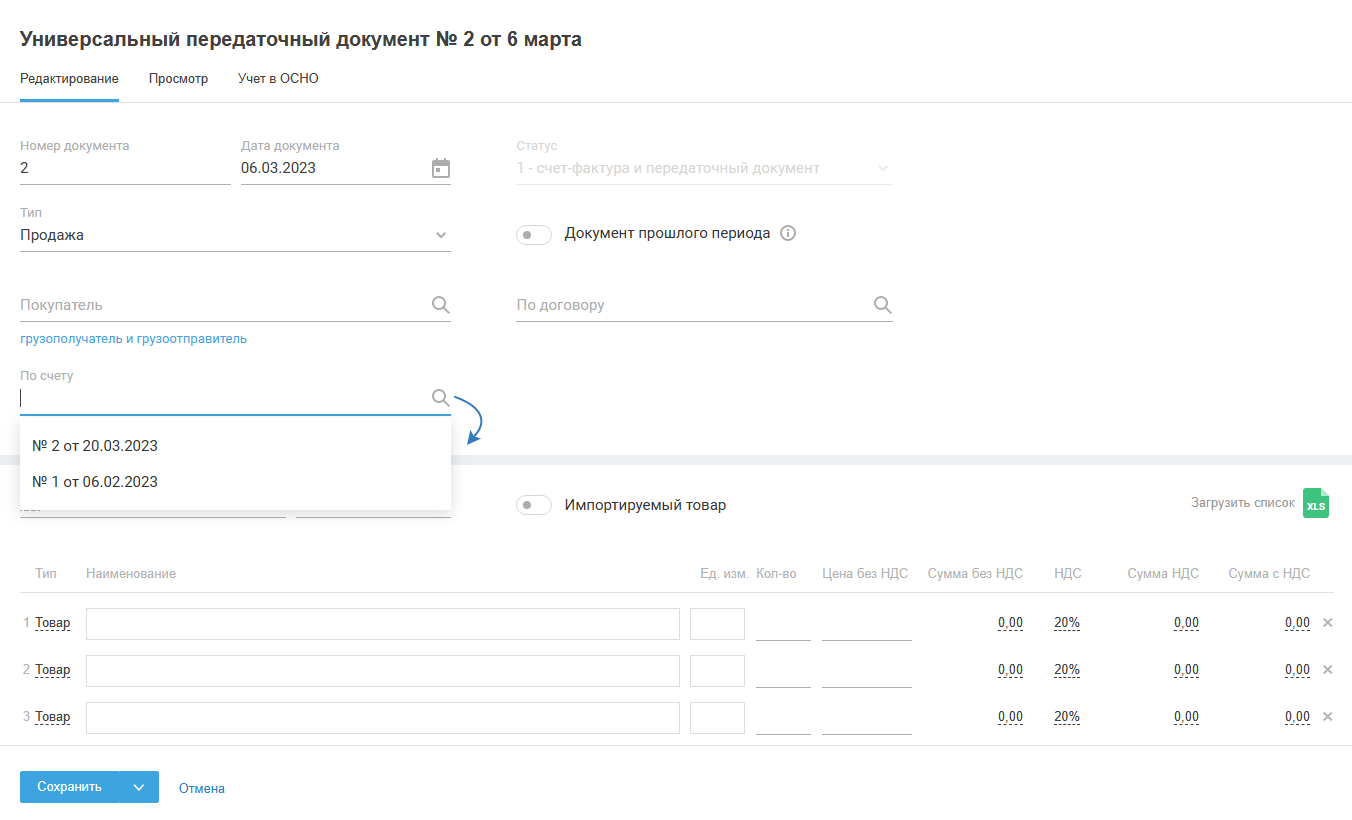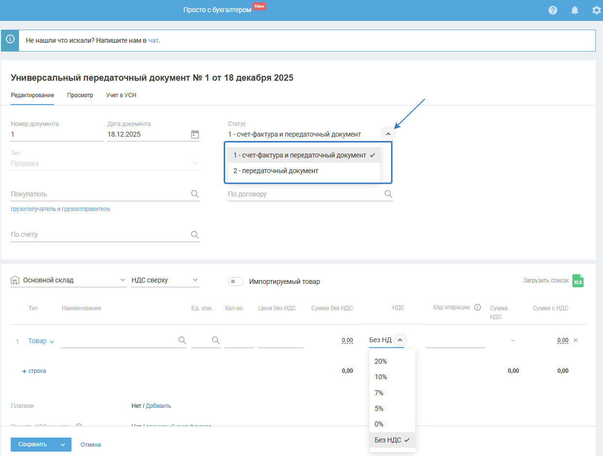 - с 2025 г. — если в счёте выделен НДС, то при создании УПД на основании данного счёта будет статус 1 и НДС в нём.