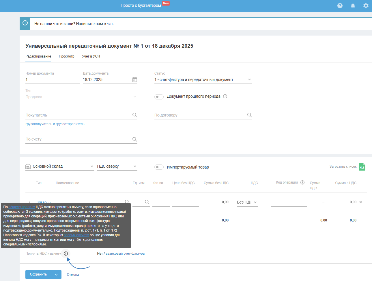 Есть определённые правила, при одновременном выполнении которых НДС можно принять к вычету, чтобы ознакомиться с ними, нажмите на значок в виде знака вопроса справа от строки «Принять НДС к вычету»: