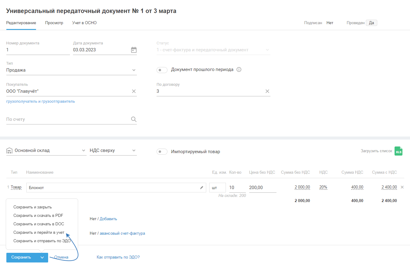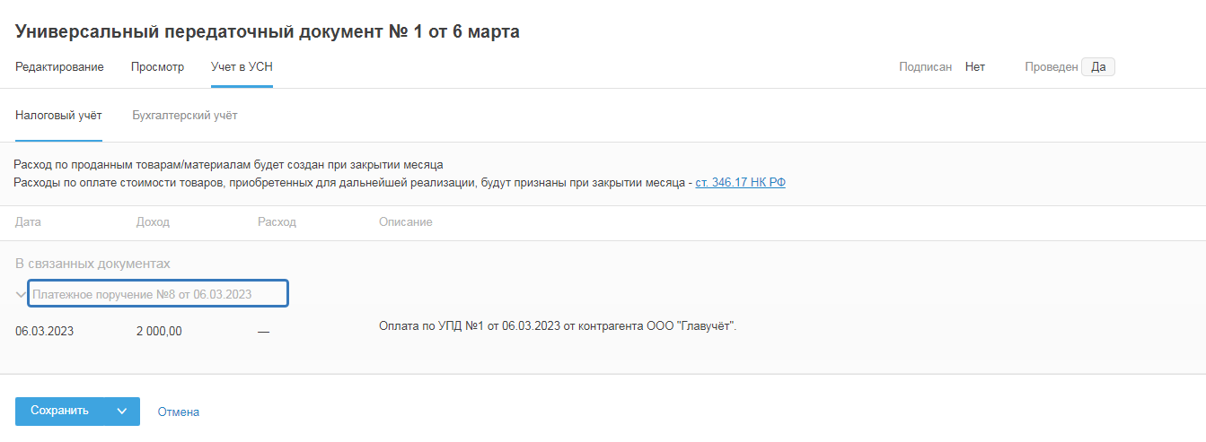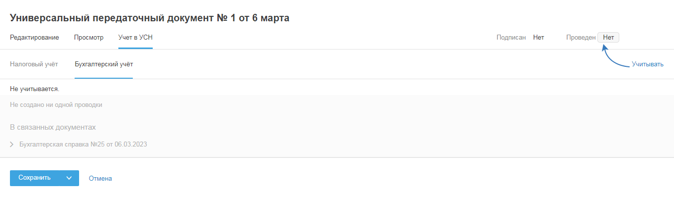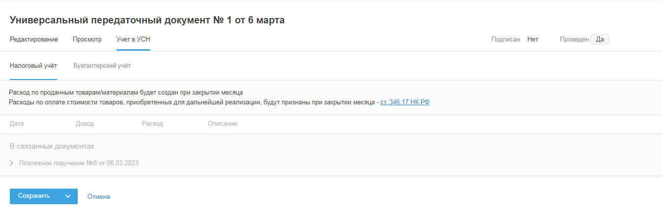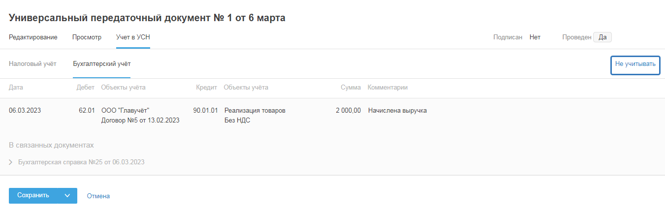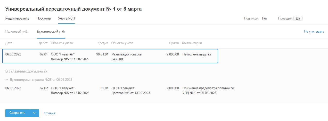 - Сохранить и перейти в учёт — чтобы перейти в режим учёта и посмотреть, как УПД проведён в бухгалтерском и налоговом учётах.