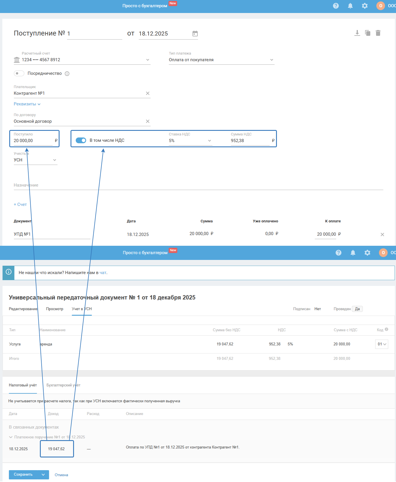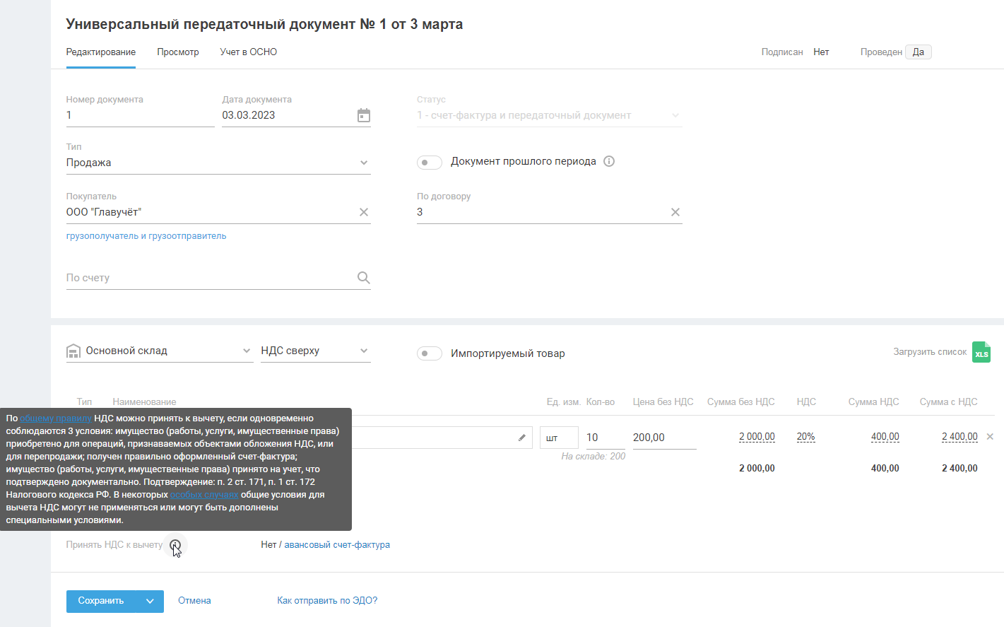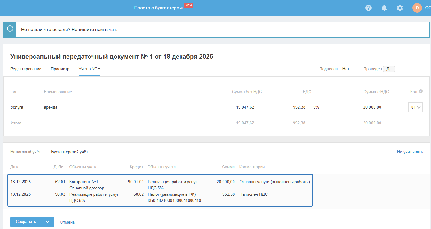 - Сохранить и перейти в учёт — чтобы перейти в режим учёта и посмотреть, как УПД проведён в бухгалтерском и налоговом учётах.
