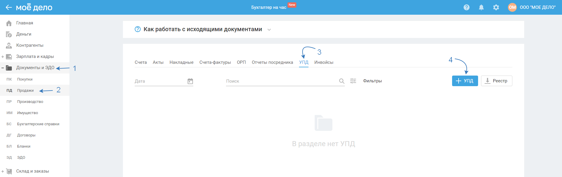 УПД (универсальные передаточные документы), выставленные покупателям, в счёт оказанных вами услуг и отгруженных товаров, необходимо отразить в сервисе. УПД является закрывающим документом к отгруженному товару и/или по оказанной услуге.