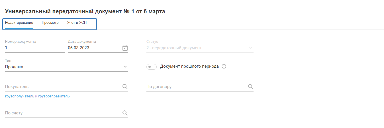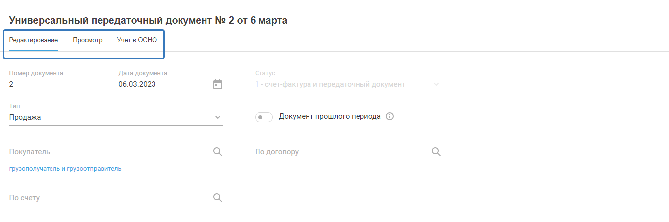 При первом создании документа или его дальнейшем редактировании, в форме УПД есть три вкладки: