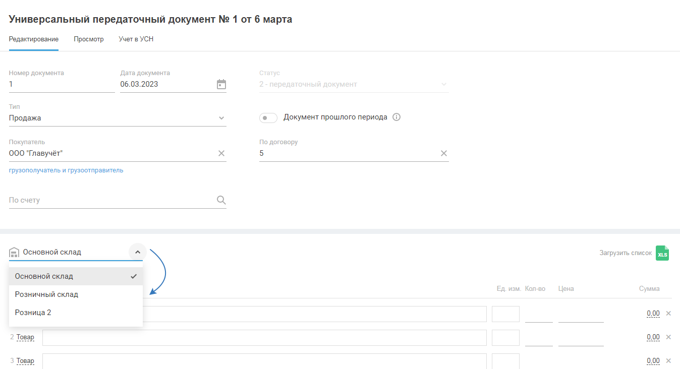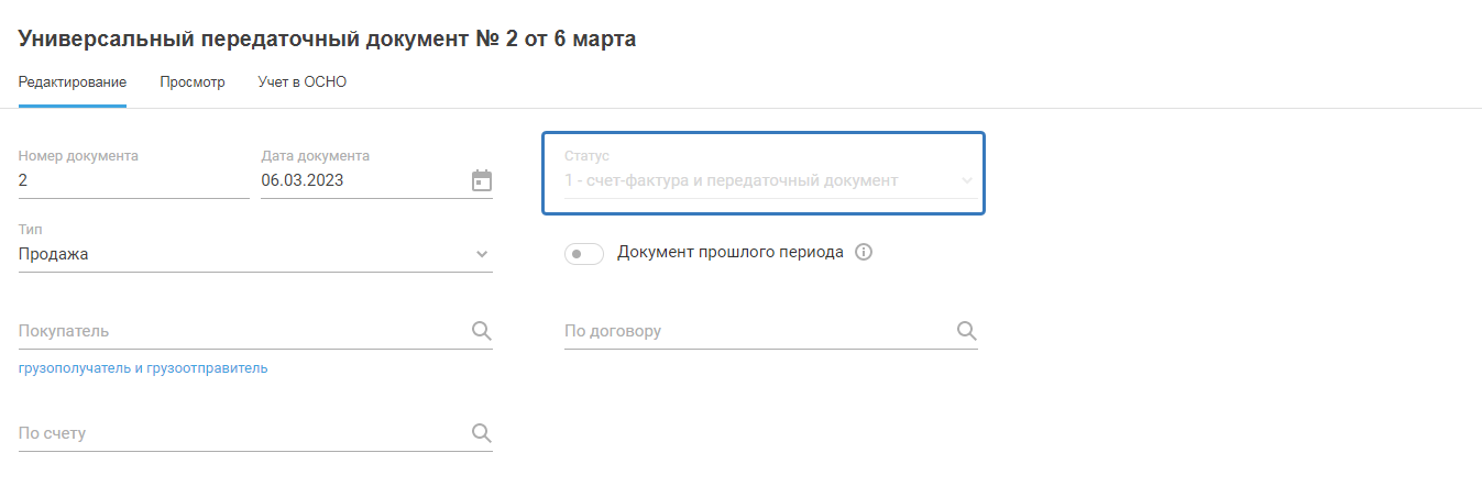 При первом создании документа или его дальнейшем редактировании в форме УПД есть три вкладки: