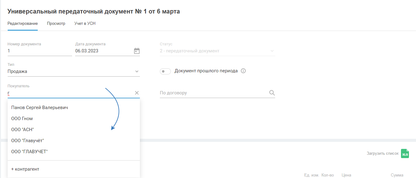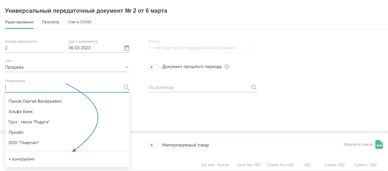 Покупатель — выберите клиента из выпадающего списка. По умолчанию в списке до 5 контрагентов расположенных в алфавитном порядке, укажите одного из них, либо начните печать наименования контрагента, после чего выберите его из списка. Если в сервисе контрагент не заведён, выберите опцию «+ контрагент» создайте нового контрагента. При необходимости заполните поля «грузополучатель/грузоотправитель». Если в УПД указаны только услуги, то в печатной форме документа в полях «Грузополучатель» и «Грузоотправитель» будут поставлены прочерки.