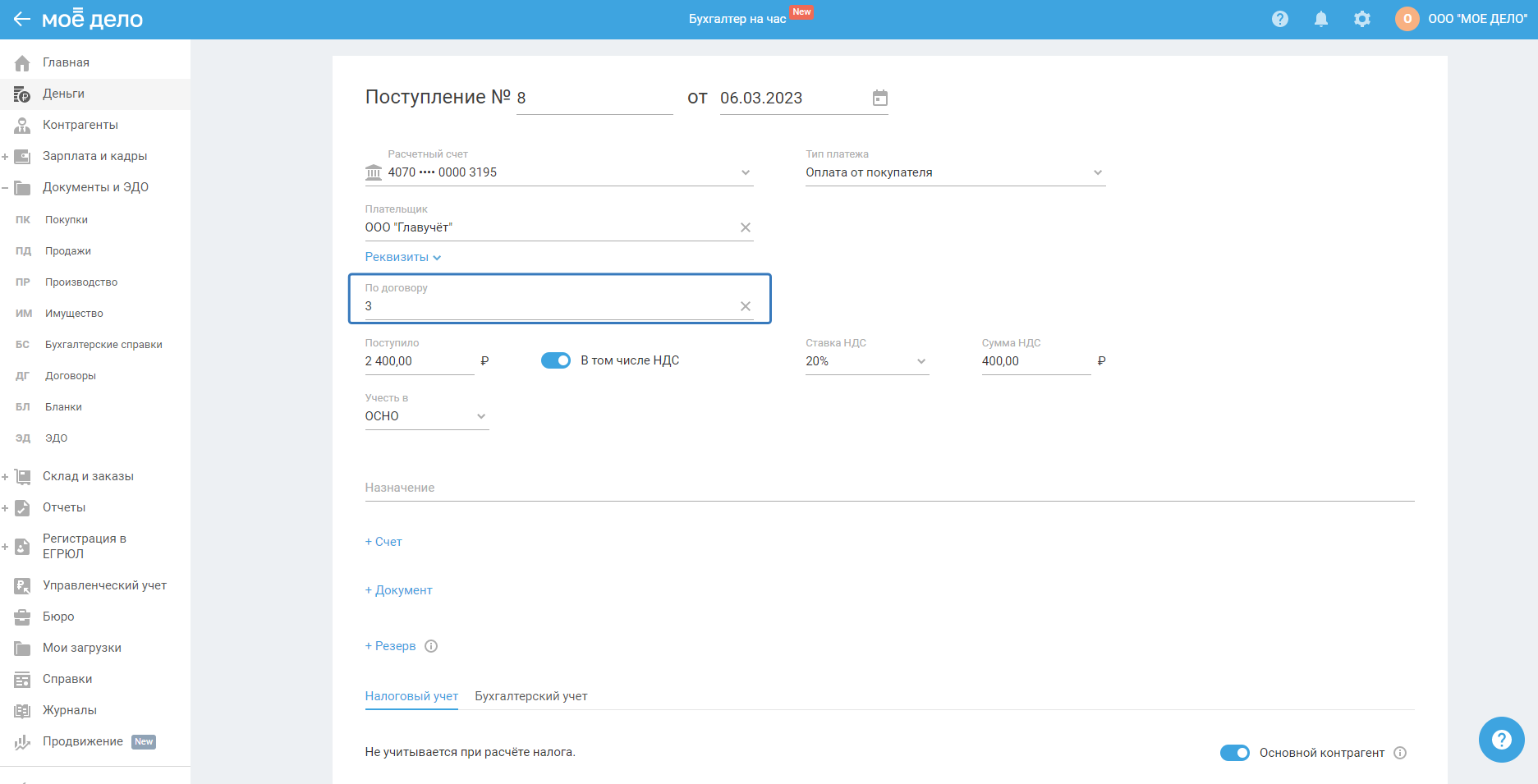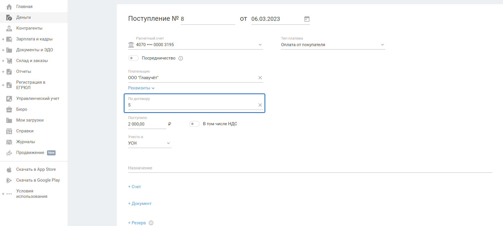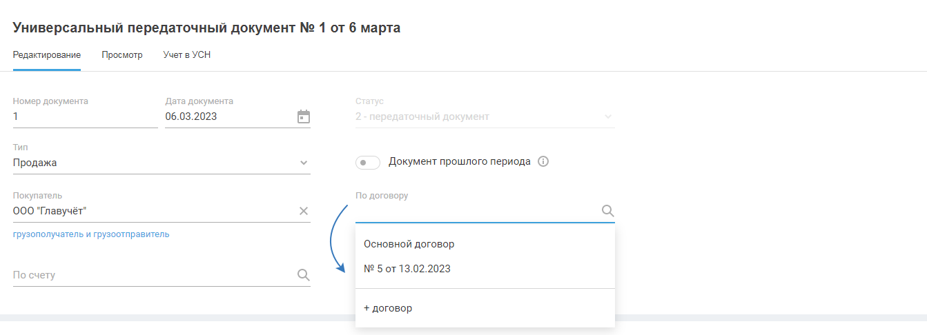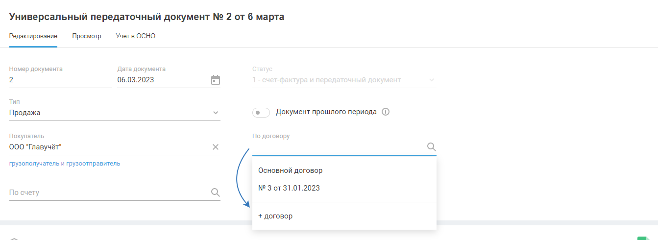 По договору — необязательное поле для заполнения. В выпадающем списке 5 последних созданных договоров, выберите один из них: