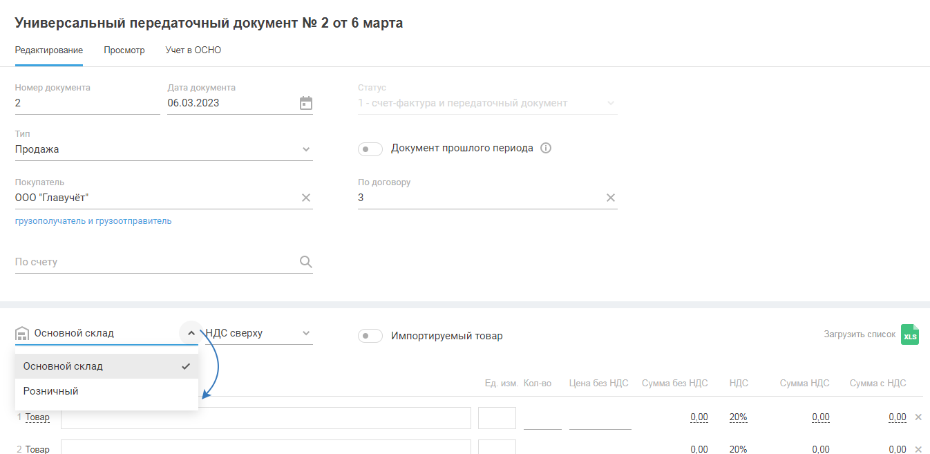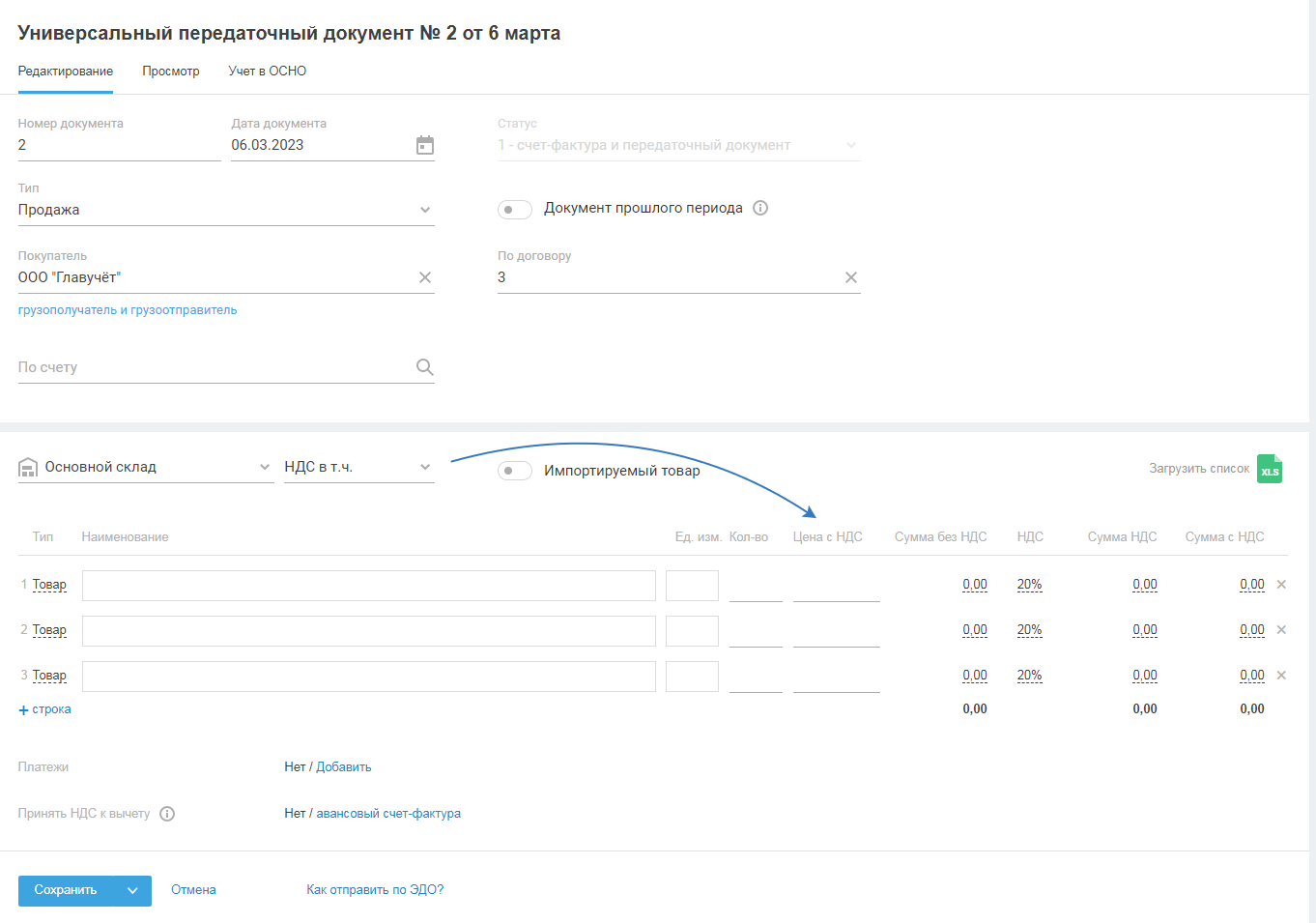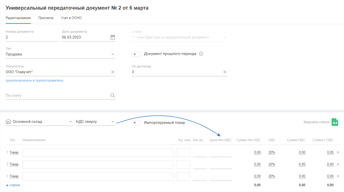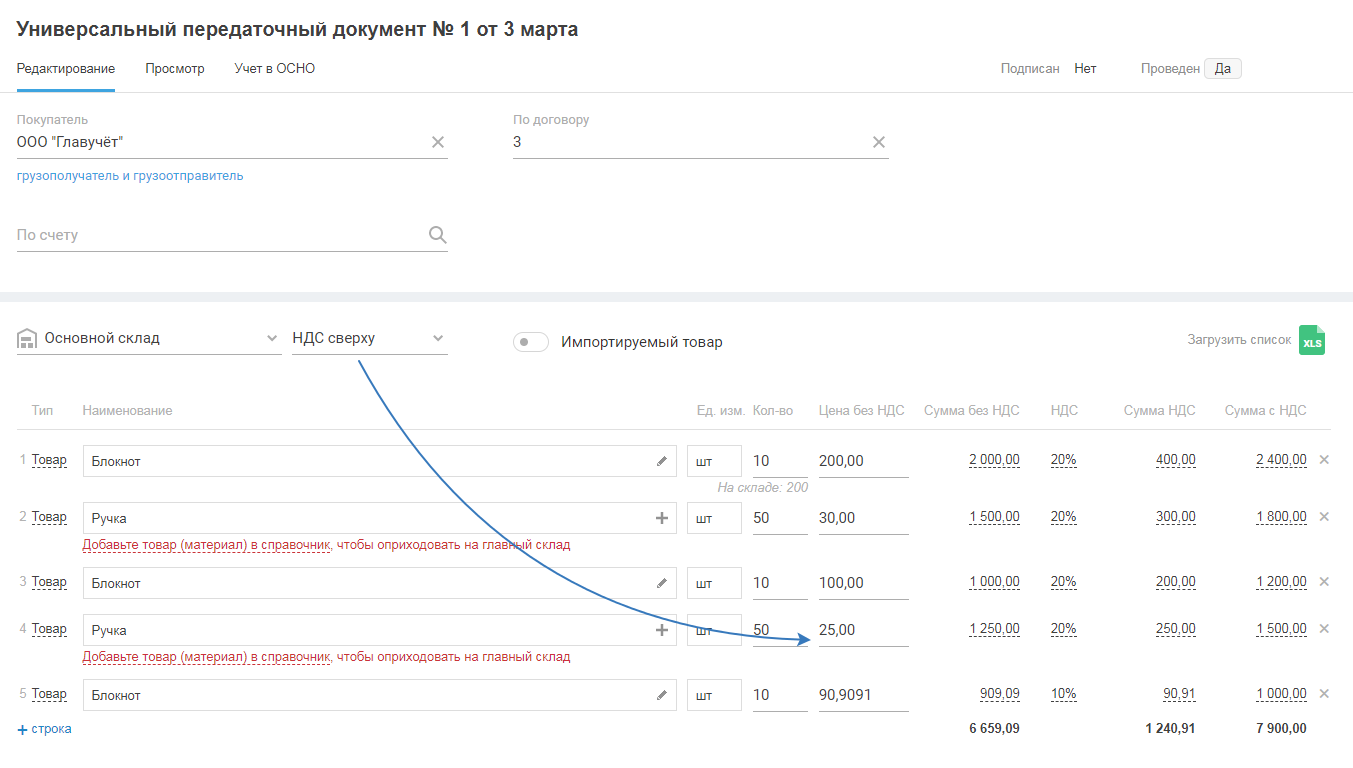 Обратите внимание, если у вас в УПД в графе НДС указано «сверху», при этом в файле со списком товаров .xls цена указывается с НДС, то при загрузке номенклатуры сервис автоматически рассчитает сумму каждого товара из файла без НДС.