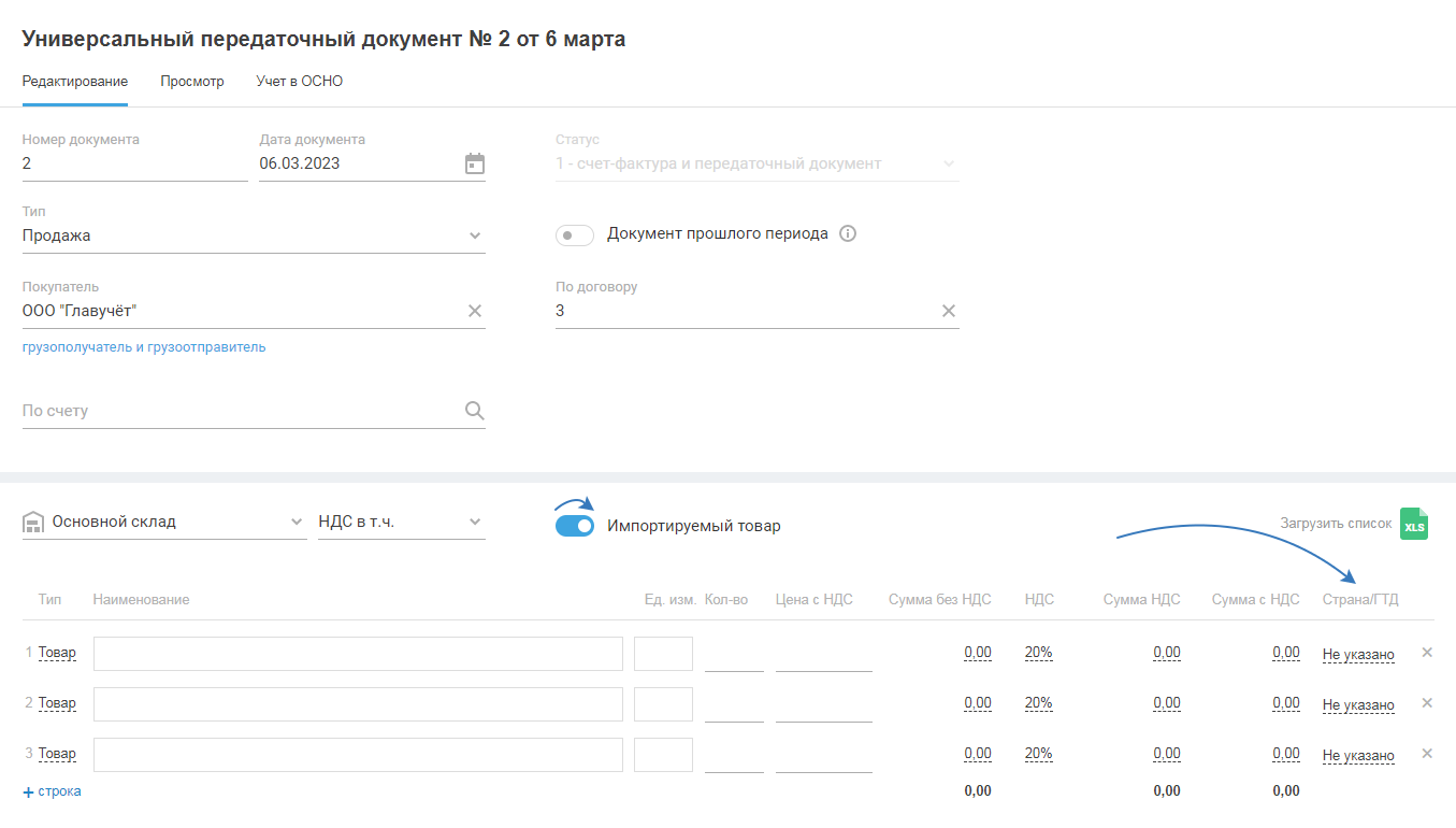 Введённые данные в колонке Страна/ГТД будут учитываться при формировании книги продаж и налоговой декларации по НДС.