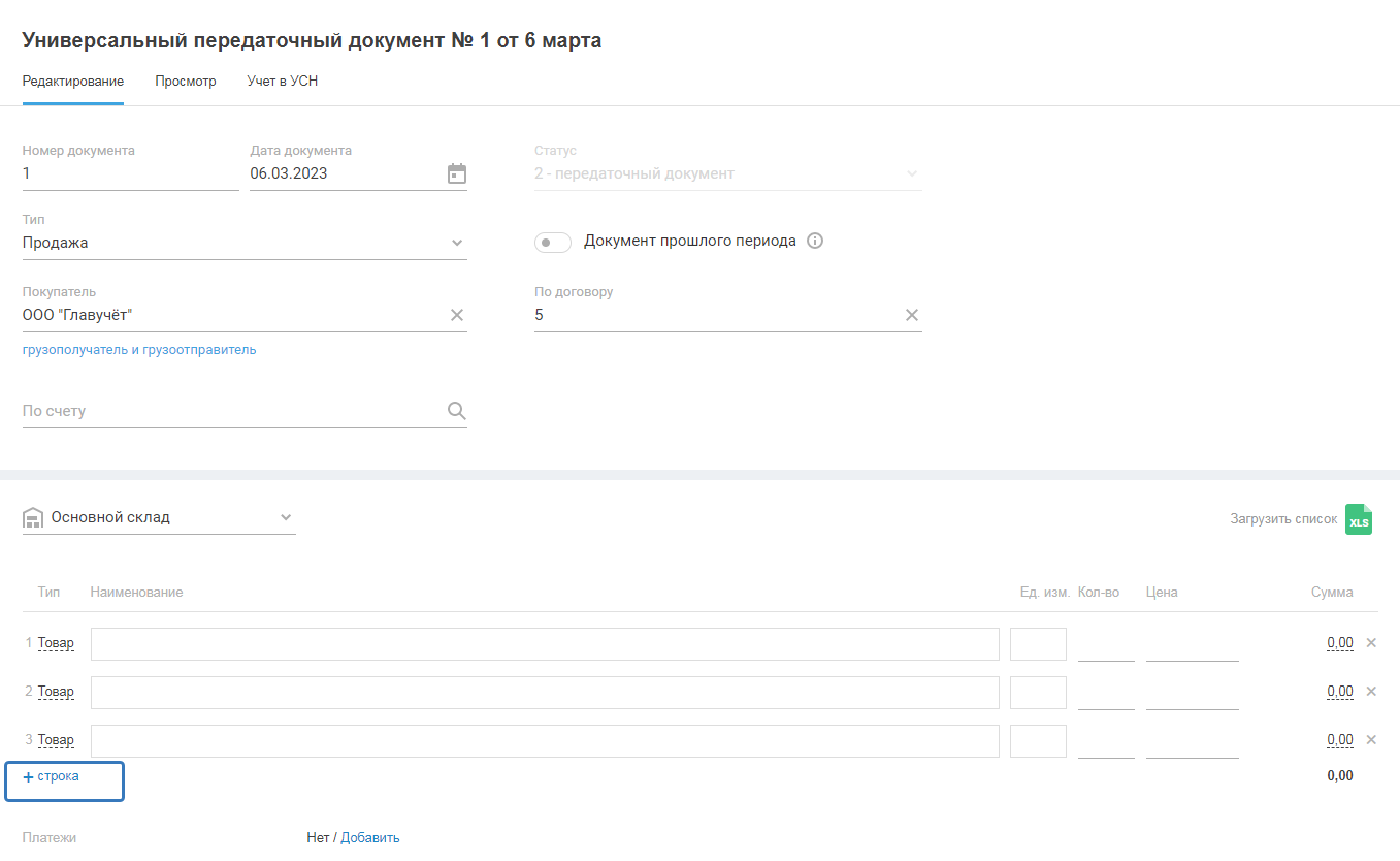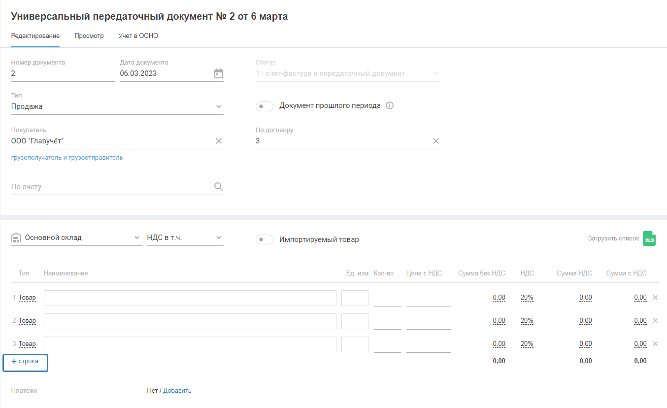 С помощью активной ссылки «+ строка» можно добавить строки, если позиций в УПД больше предложенных по умолчанию строк: