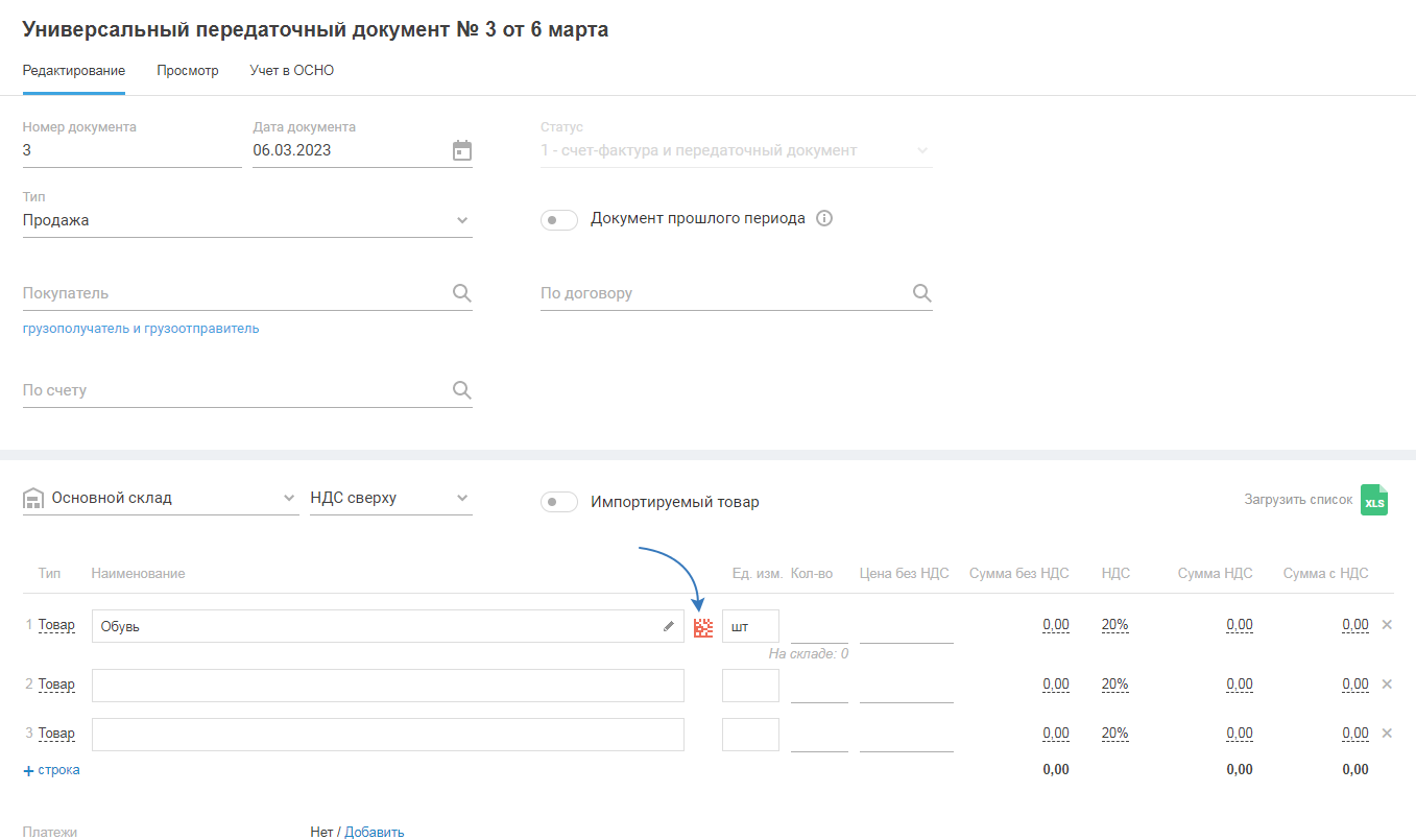 При выборе маркированного товара в УПД появляется иконка DATA MATRIX кода:
