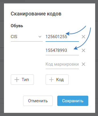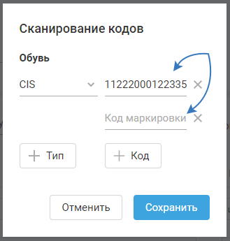 При клике на неё открывается окно ввода кодов маркировки. Вы можете ввести их вручную или просканировать 2D сканером код на упаковке.
