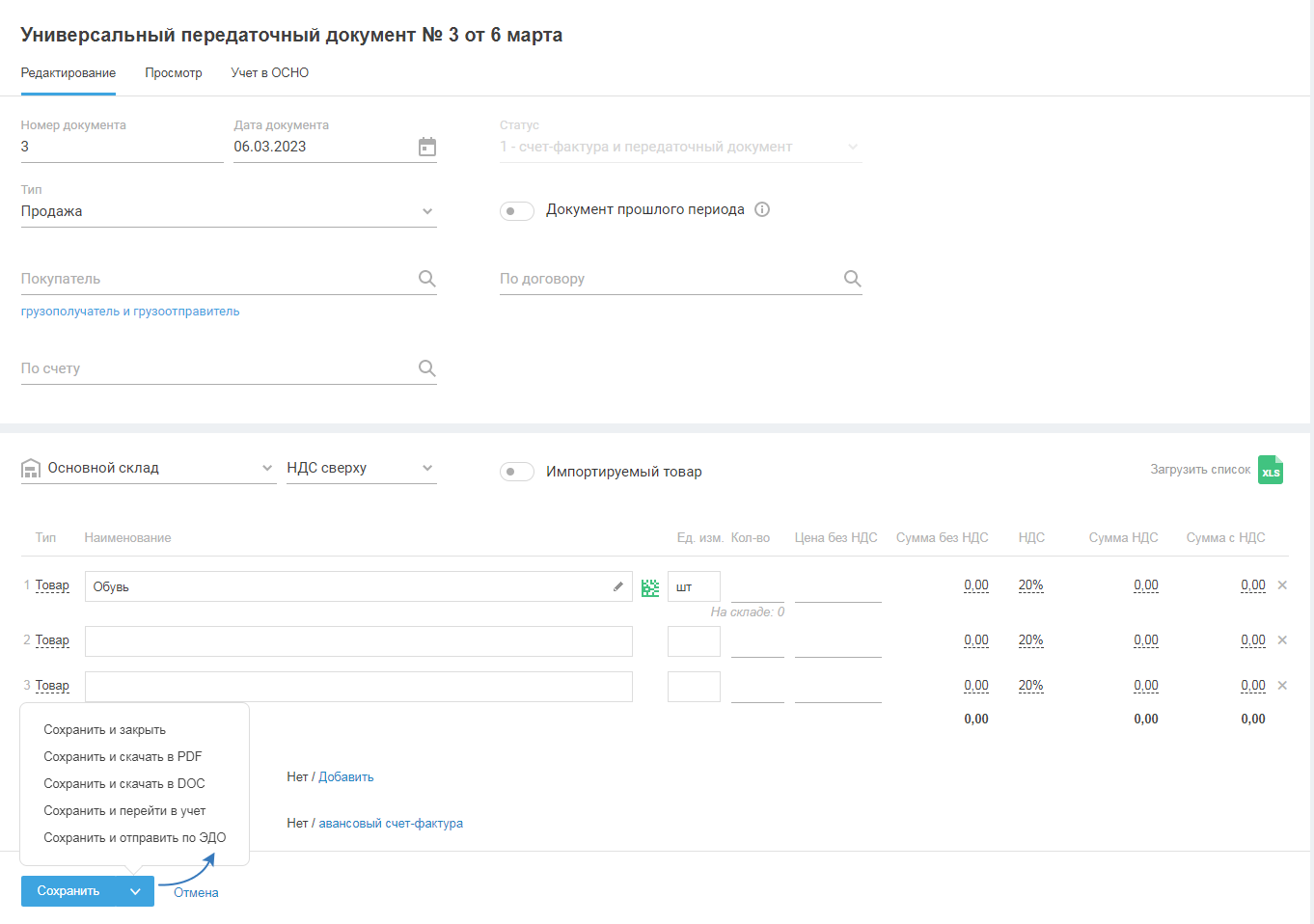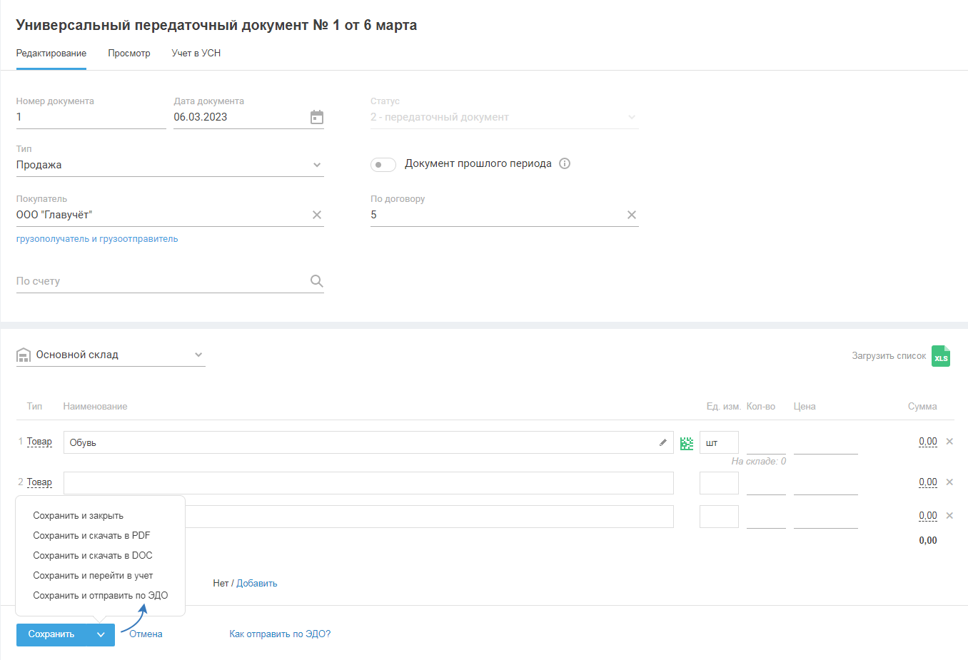 Перейти во вкладку «Учёт» можно при создании УПД, после заполнения всех необходимых полей, для этого нажмите на кнопку «Сохранить и перейти в учёт»: