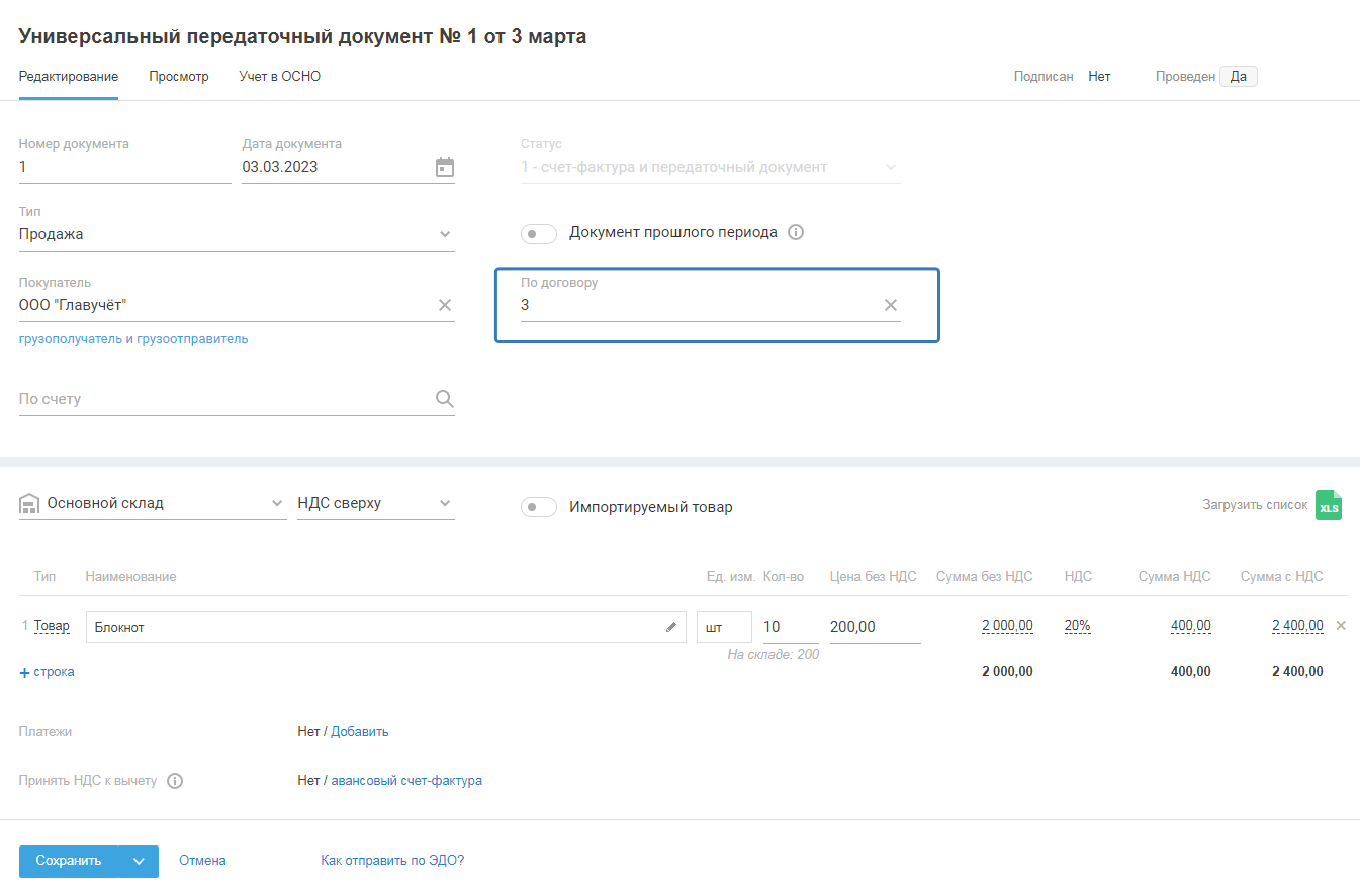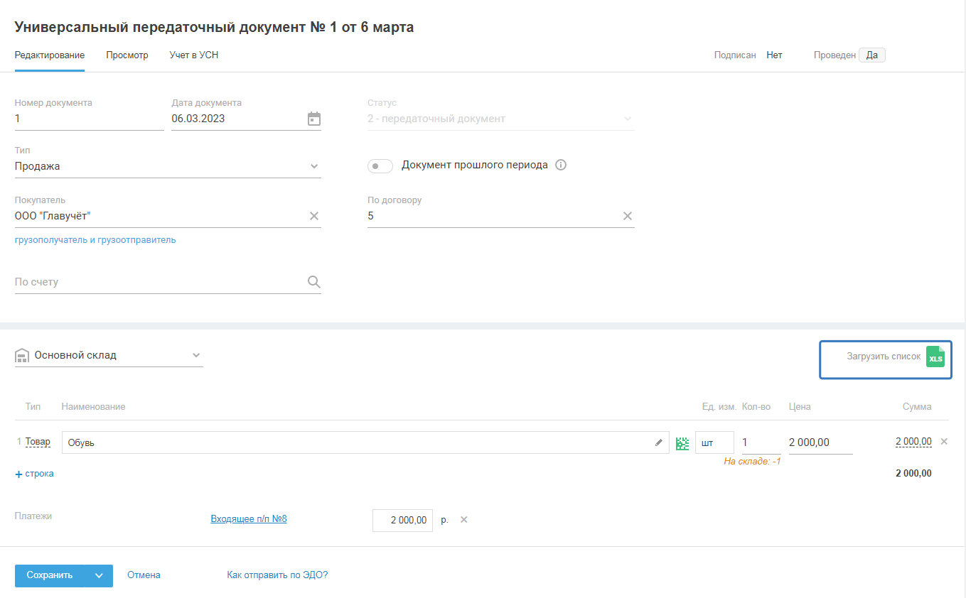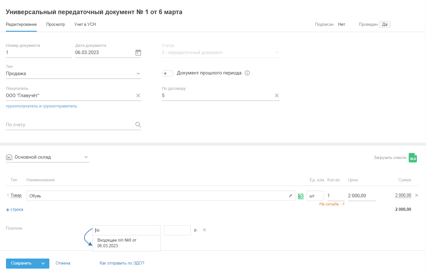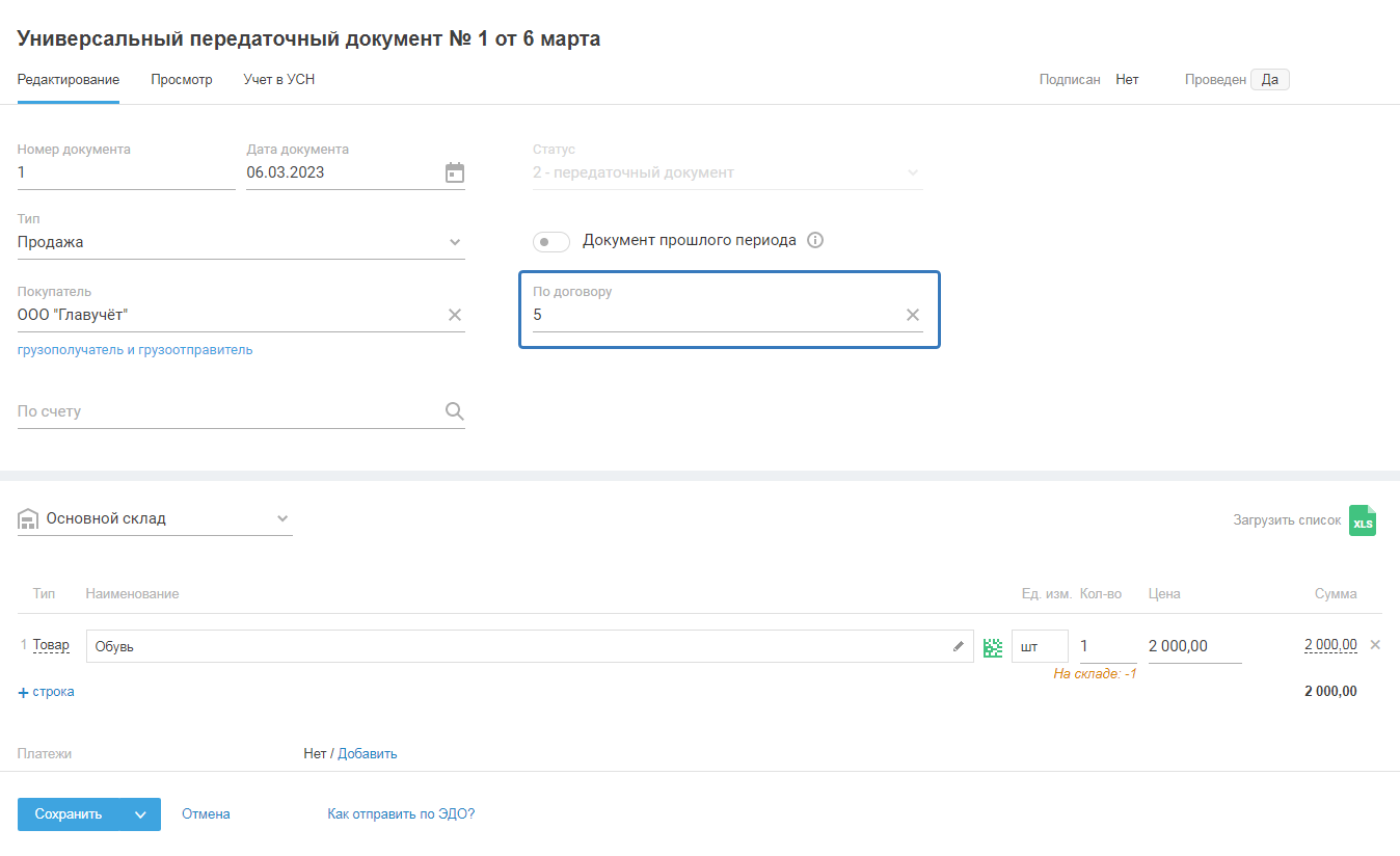 При этом после сохранения УПД, изменится статус документа c «да» на «нет»: