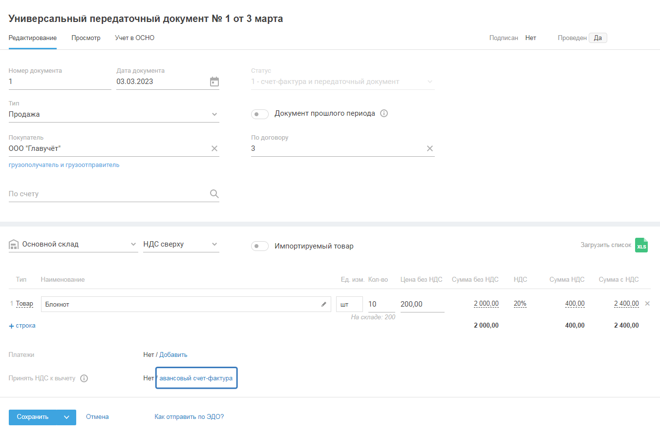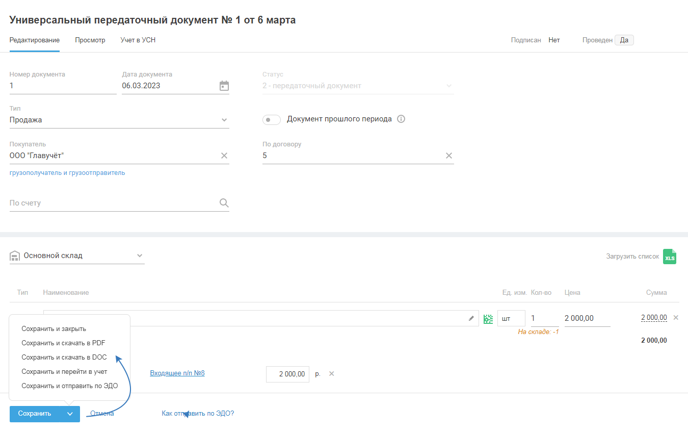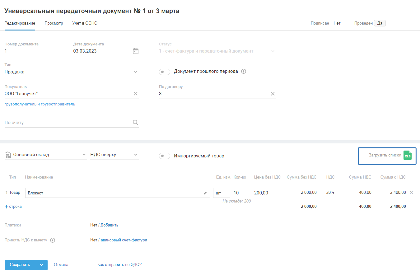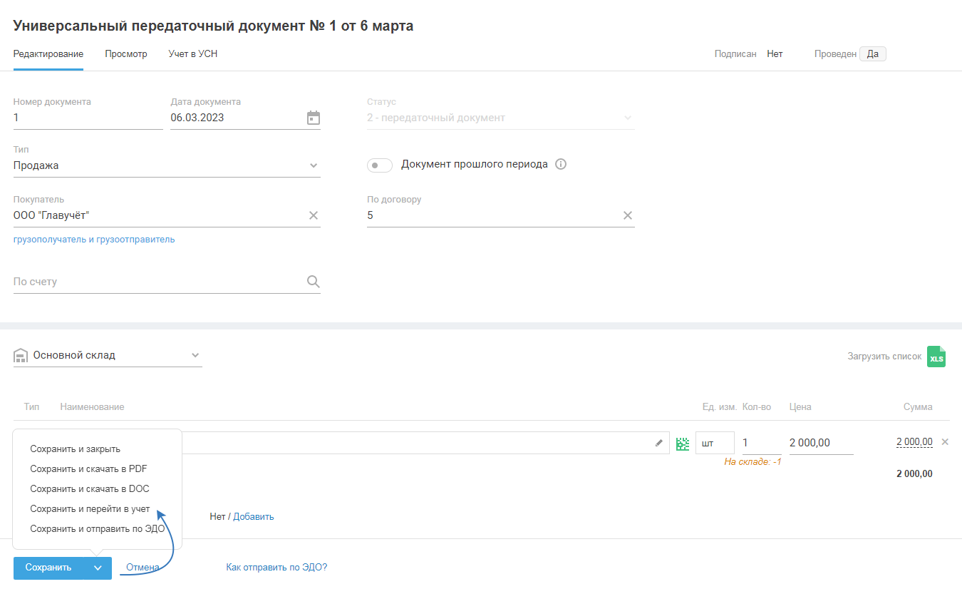 При этом после сохранения УПД, изменится статус документа c «да» на «нет»: