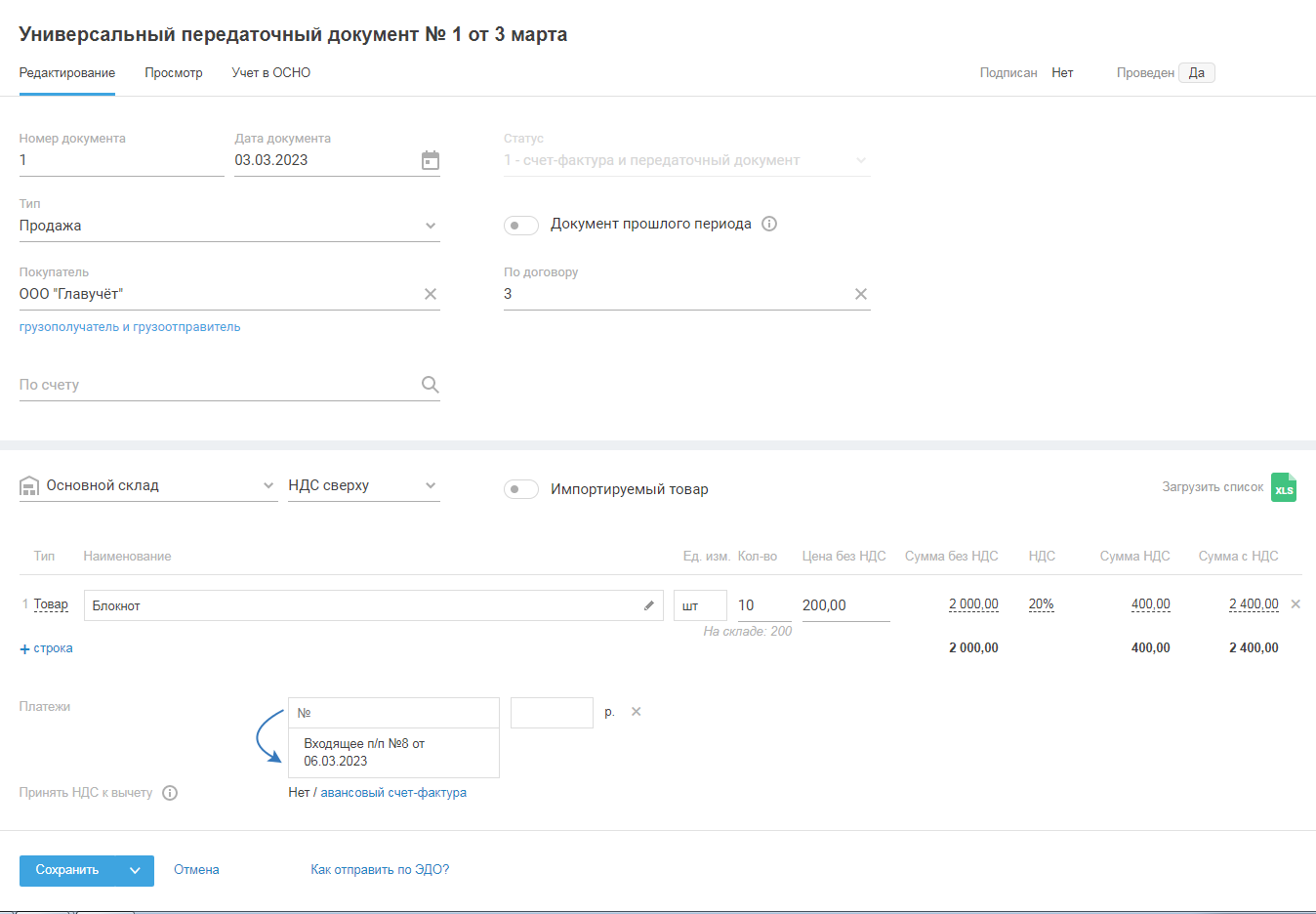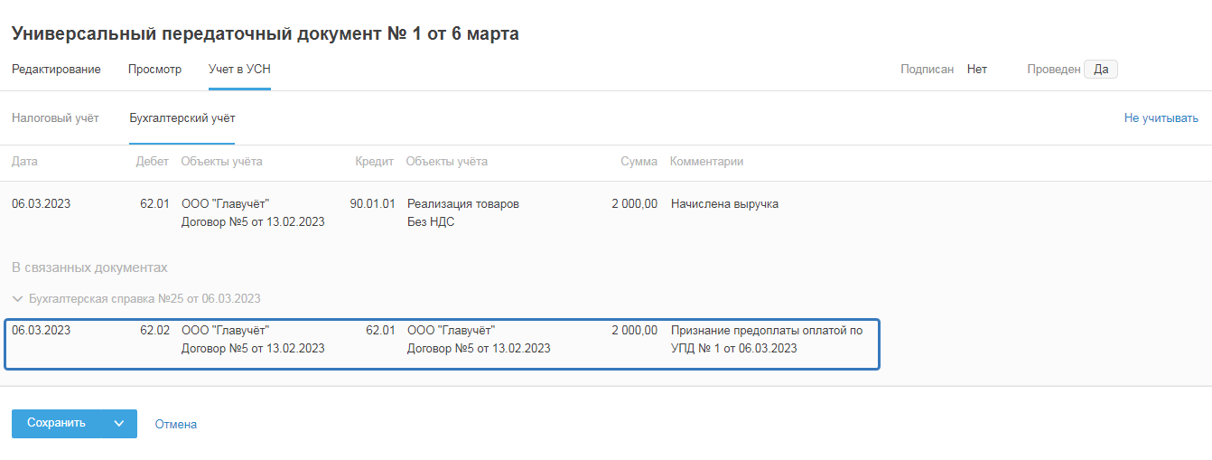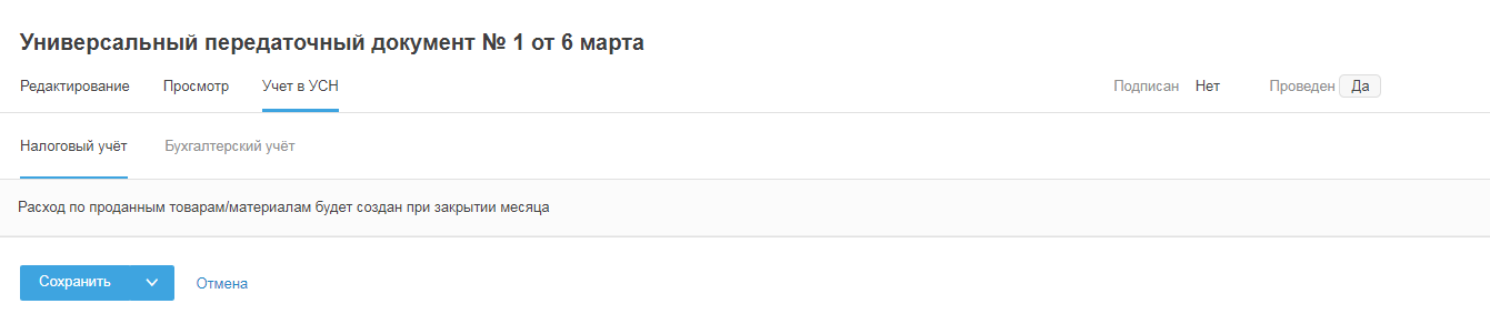- Сохранить и перейти в учёт — чтобы перейти в режим учёта и посмотреть как УПД проведён в бухгалтерском и налоговом учётах.