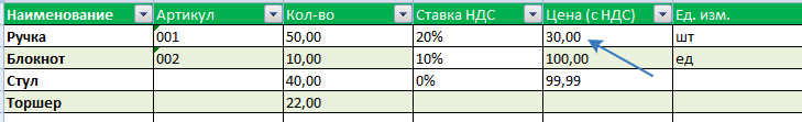 Например, при заполнении файла мы указали цену с НДС 30 руб. Загрузив файл в УПД, в графе «Цена без НДС» отразилась цена за вычетом НДС 25 руб.: