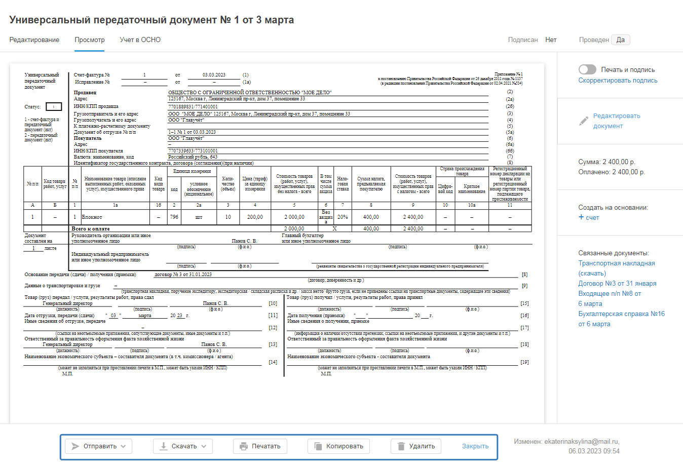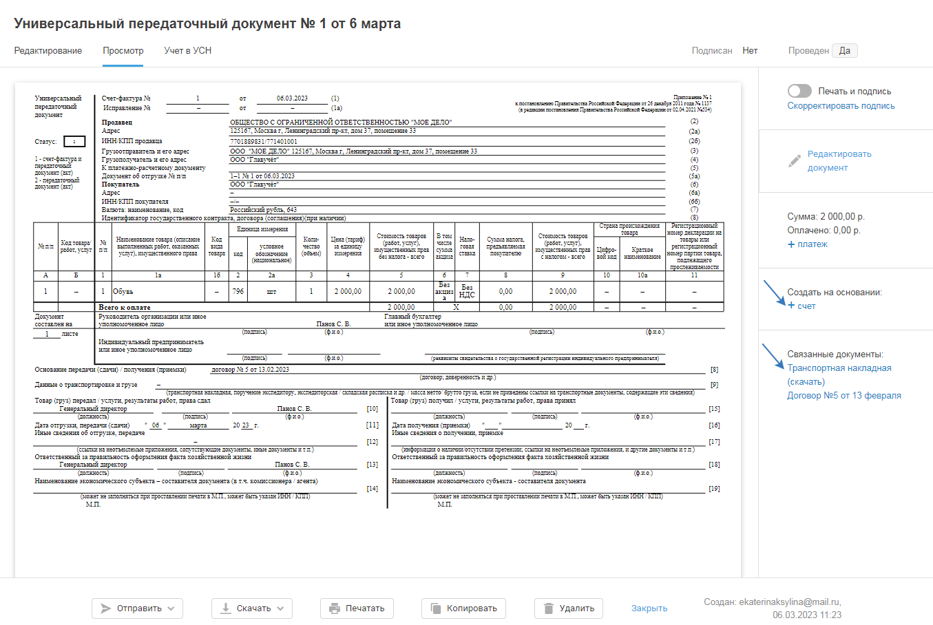 В режиме «Просмотр» есть возможность создать на основании УПД счёт, а также скачать транспортную накладную.
