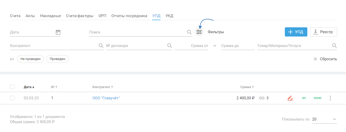 Для быстрого поиска документа вы можете воспользоваться расширенным фильтром, для этого во вкладке «УПД» нажмите на кнопку «Фильтры»: