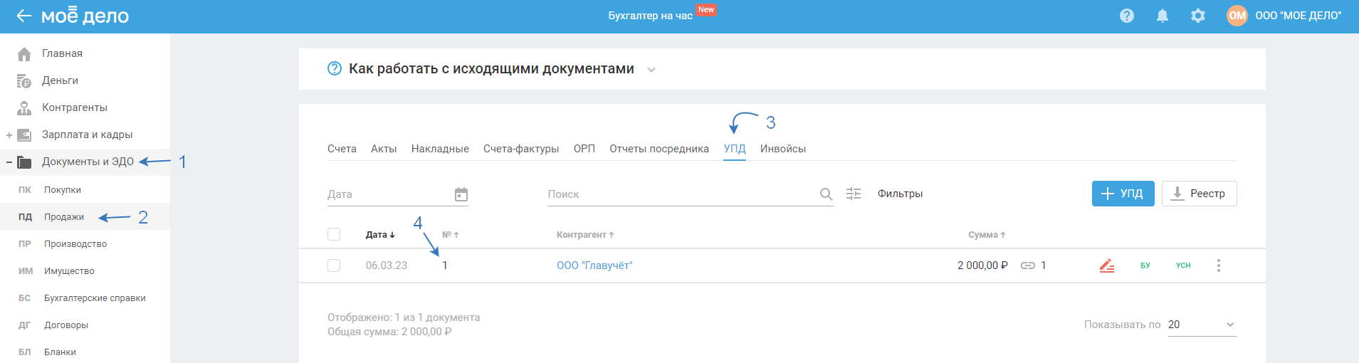 - Сохранить и закрыть — загрузится раздел «Документы и ЭДО — Продажи — УПД».