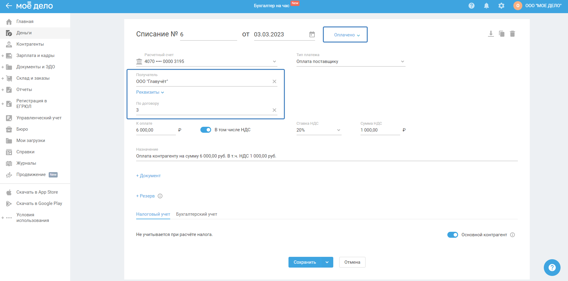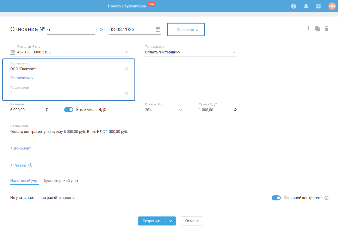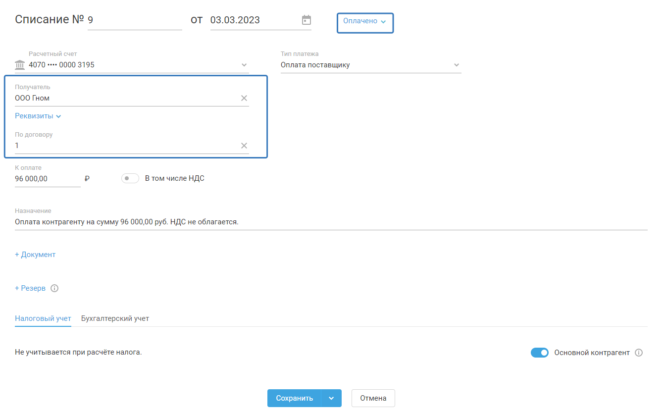 - Сумма без НДС, сумма и ставка НДС, сумма с НДС — заполняются автоматически;